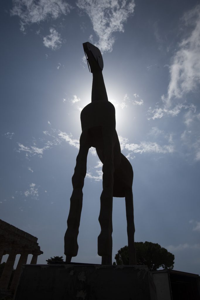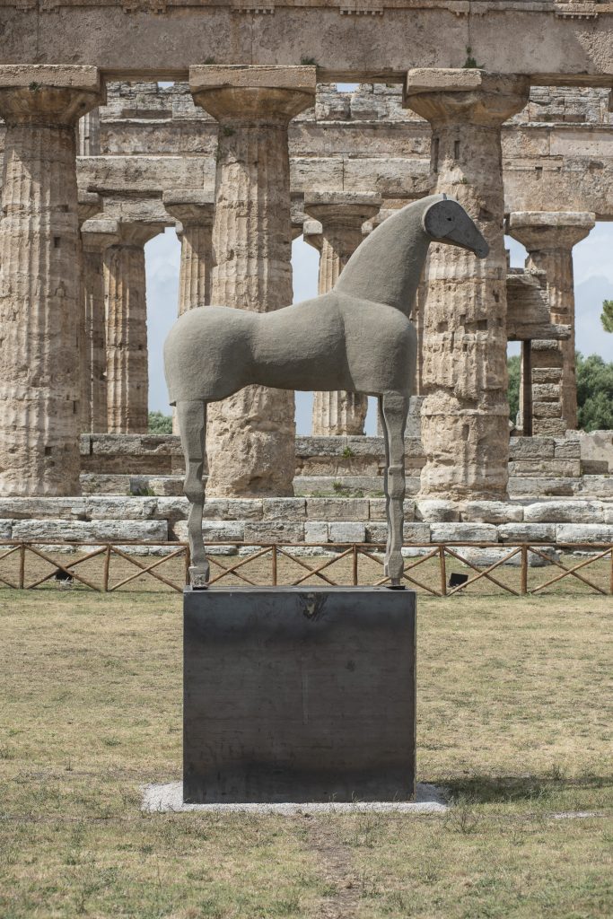 Dall’11 luglio, anche Paestum ha la sua icona contemporanea. Ma mentre a Pompei e Agrigento sono le opere neoclassiche di Mitoraj a mettere in dialogo l’archeologia e il contemporaneo, a Paestum è il linguaggio arcaico di Mimmo Paladino a mergersi con le architetture doriche di sesto e quinto secolo a.C. È, infatti, il primo dei famosi cavalli realizzati dall’artista, il “padre della mandria” come l’ha chiamato scherzosamente Paladino, a tornare nel luogo per il quale era originariamente concepito, ma da dove è stato portato via da tempo.