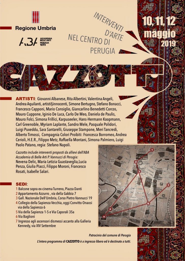 CAZZOTTO, ideato e coordinato dagli artisti, Simona Frillici e Giassi Piagentini, è un evento che propone un modo non convenzionale di porre e fruire l’arte contemporanea in stretto rapporto con la città di Perugia.