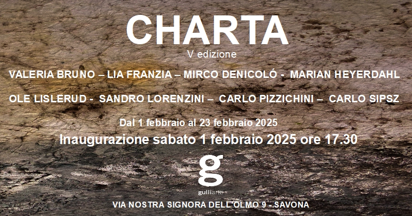 Sabato 1 febbraio 2025, dalle ore 17.30, fino al 23 febbraio 2025, ritorna in Galleria GULLIarte, a Savona in Via Nostra Signora dell'Olmo 9, la colltettiva a tema sulla carta, giunta alla quinta edizione dal titolo: CHARTA