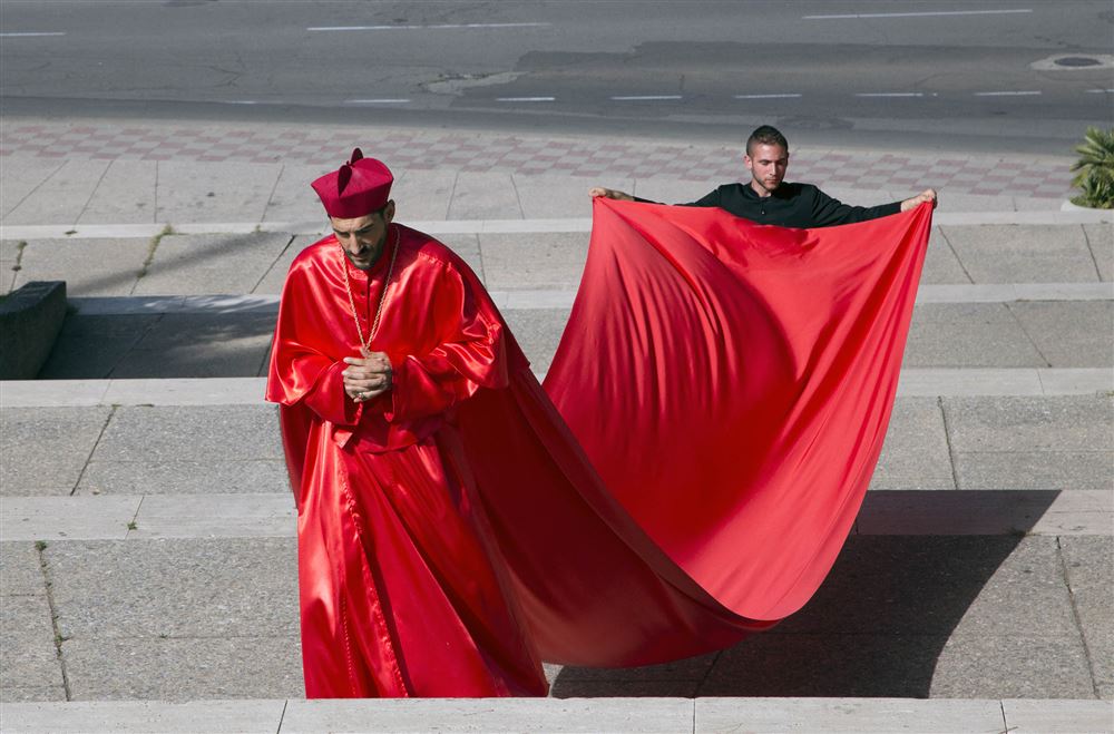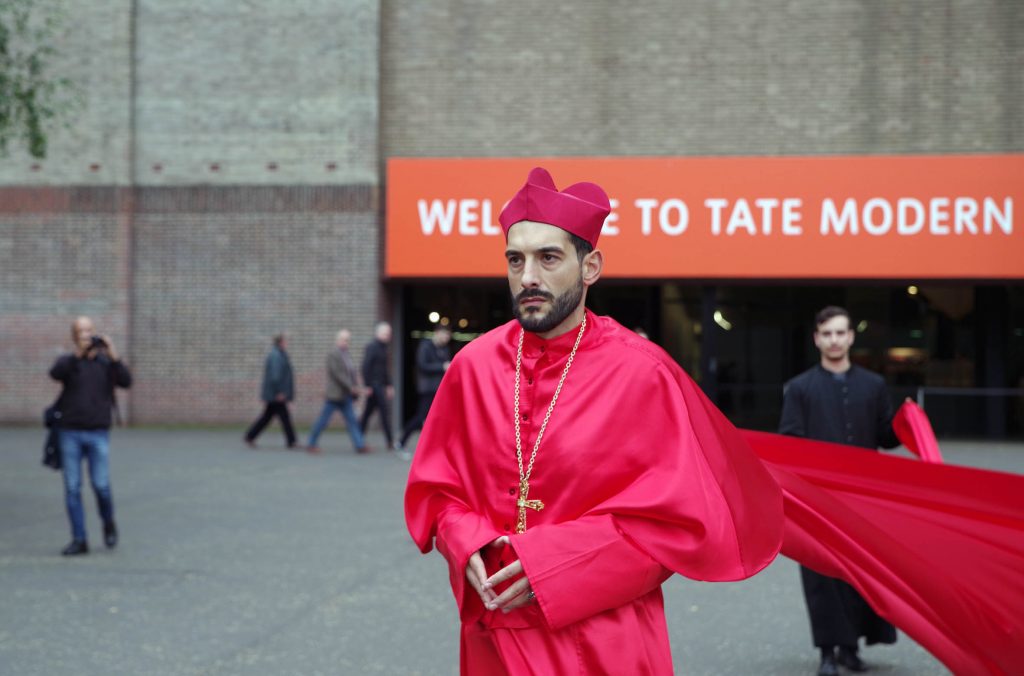 Con la sua performance-azione Nicola Mette desidera indurre gli spettatori a riflettere sulle contraddizioni e sull’ipocrisia delle istituzioni cattoliche.