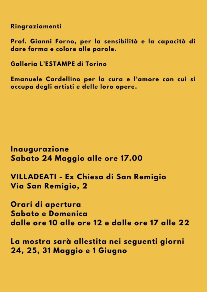 La mostra, organizzata dal Comune di Villadeati, nella persona del Sindaco Angelo Ferro, in collaborazione con la prestigiosa Galleria L’Estampe di Torino, si terrà presso la splendida ex chiesa di San Remigio a Villadeati; saranno esposte circa venti opere pittoriche dei due grandi artisti piemontesi, accomunati dall’amore appassionato per l’opera di Vincent Van Gogh. I paesaggi dei due autori si incontreranno e si scambieranno occhiate amichevoli e complici nell’abbraccio ideale del comune maestro.