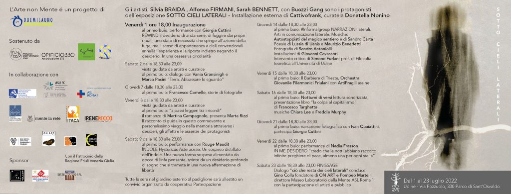 A corredo delle mostre, durante ogni serata, ci sarà la partecipazione di altri artisti e performer che interpreteranno il tema di questa edizione “SOTTO CIELI LATERALI” e nel giardino esterno ci saranno alcune installazioni artistiche di Cattivofrank.