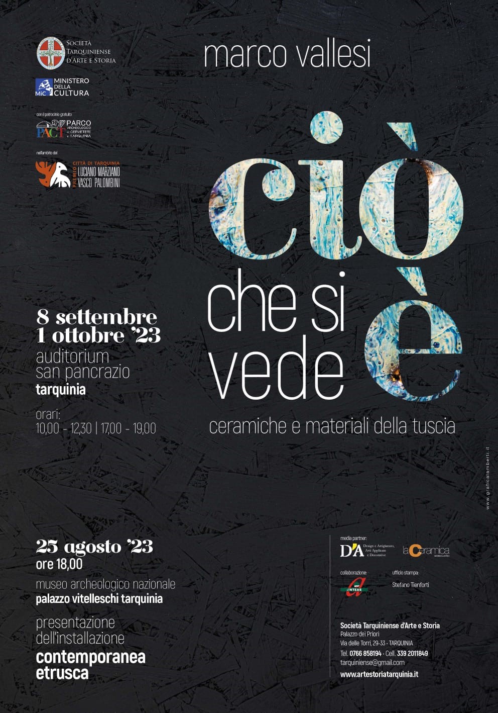 Aprirà al pubblico venerdì 8 settembre, alle 18, all’auditorium San Pancrazio, al civico 15 di via delle Torri, nel centro storico di Tarquinia, la mostra del ceramista Marco Vallesi intitolata “ciò che si vede è”. L’esposizione è promossa dalla Società Tarquiniense d’Arte e Storia (Stas), con sostegno del Ministero della Cultura (MiC), e s’inserisce nell’ambito del Premio Città di Tarquinia “Luciano Marziano-Vasco Palombini”, la biennale d’arte che la Stas organizza per valorizzare la produzione ceramica contemporanea, artistica e artigiana, la quale, nella cittadina tirrenica, affonda le sue radici in pratiche antiche, tanto da essere stata a pieno titolo accolta nell’Associazione Italiana Città della Ceramica (AiCC).