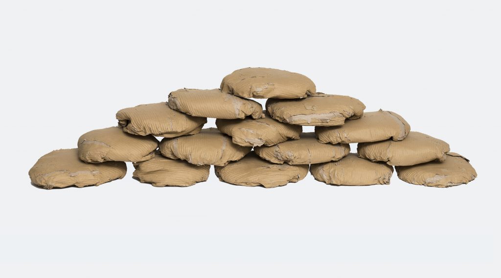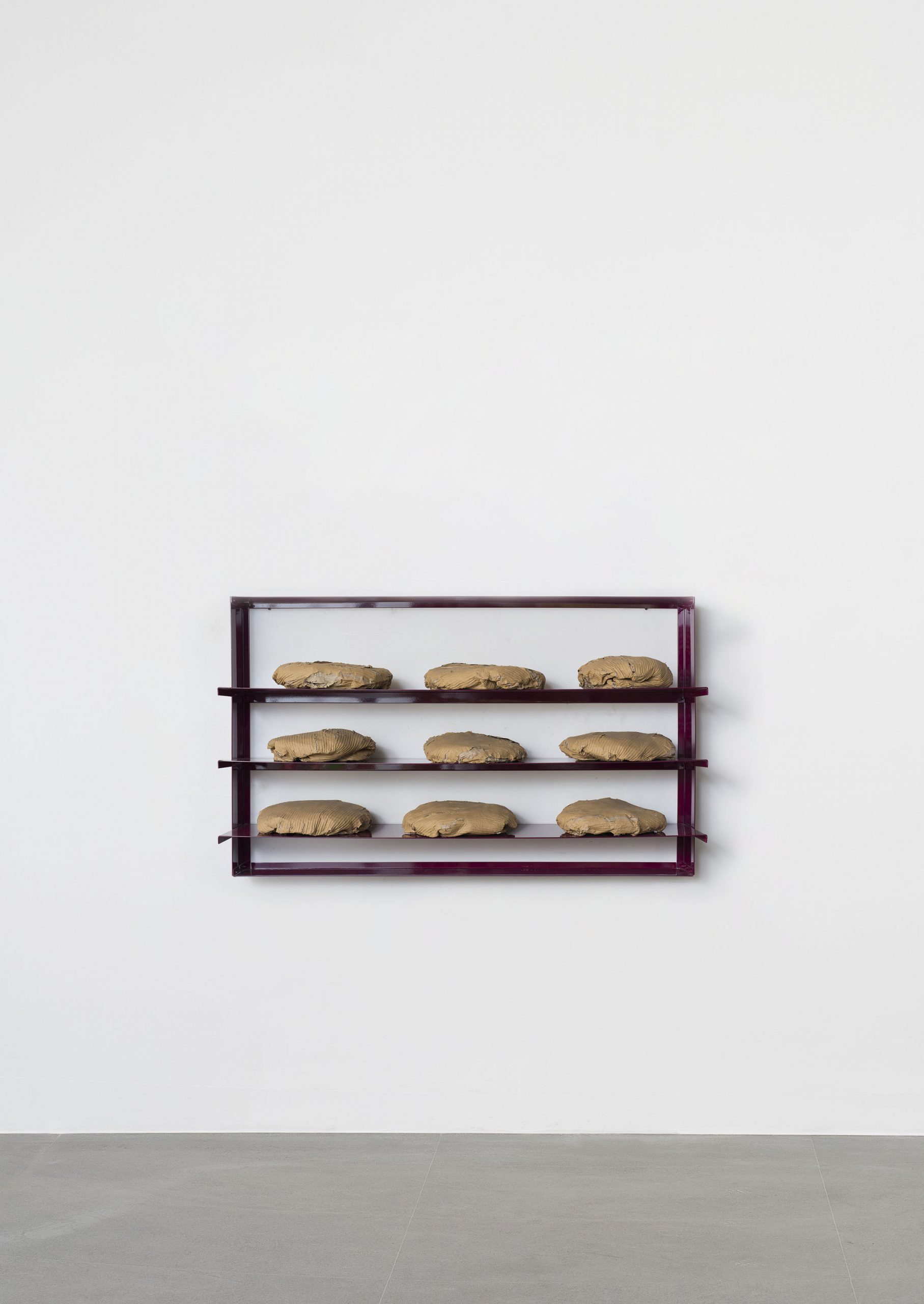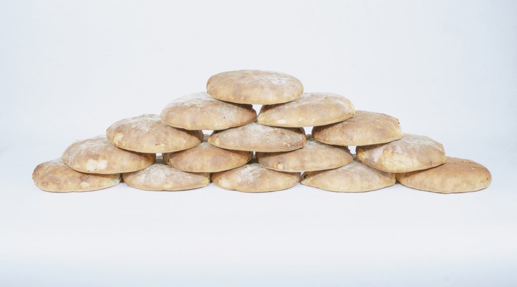 La seconda opera, 9 Pani per Aleppo del 2016, è una mensola in alluminio verniciato su cui sono allineati pani in cartone pressato, richiamando esplicitamente “World Food Day”. E’ stata realizzata in occasione del lungo assedio subito dalla città di Aleppo.