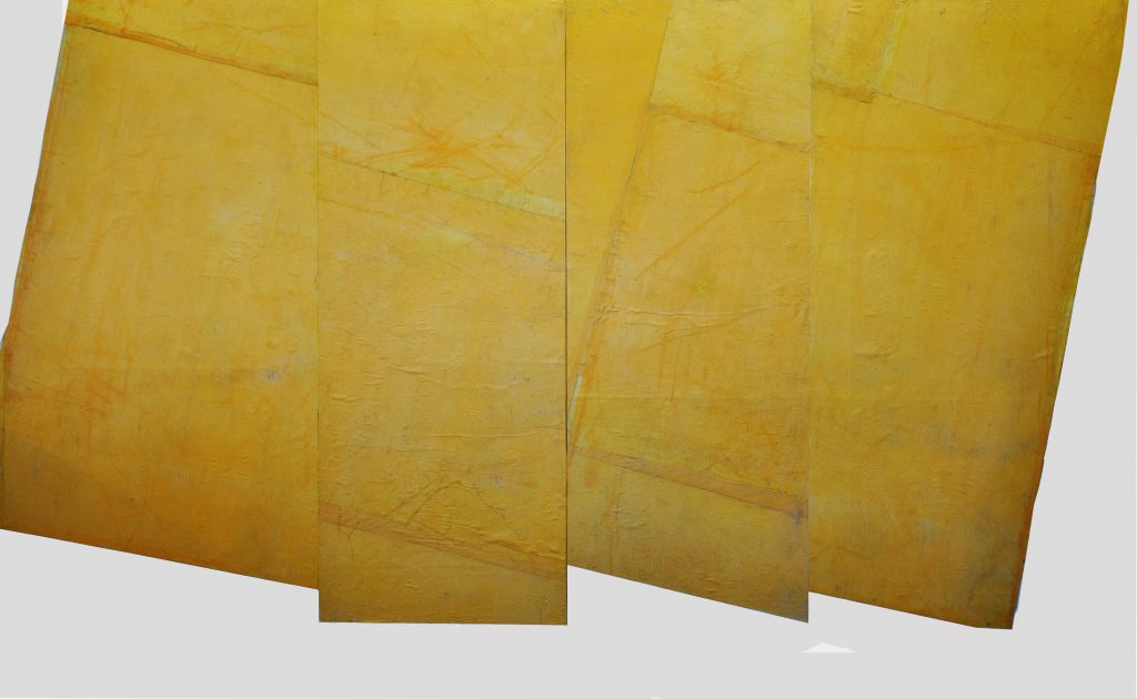 Il testo in catalogo, curato da Rachele Ferrario, recita: “ …Guardo il suo bosco di monoliti in acciaio corten esposto in questa mostra e ho voglia di abbracciarli o di passarci in mezzo o intorno. La lucidatura in alcuni punti restituisce una superfice falsata: sembra la corteccia di un albero. Quando poi li tocco traballano. E sono freddi. Al contrario di ciò che sembra scopro che ogni blocco non ha quasi peso, è leggerissimo. È la loro forma a restituirne la consistenza come fossero massi di pietra che evocano mondi antichi o altri mondi. Mi accorgo che è teatro, finzione, messa in scena di un universo metafisico, in cui tutto è sospeso. Ma ogni cosa che è sulla terra ruota con essa. Forse per questo i “tronchi” in acciaio simili alla corteccia di un albero con le radici accennano a una torsione? Sono collegati a quel movimento?