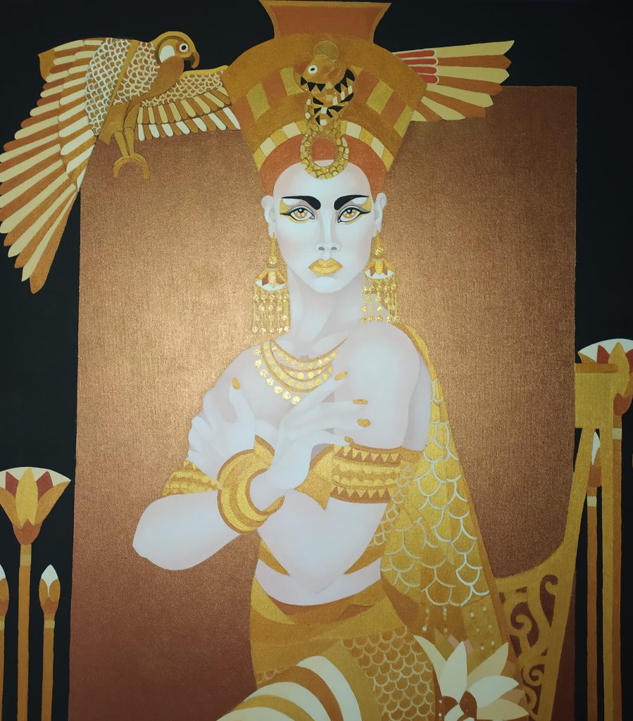 Circa 25 opere dedicate alla grande Regina Cleopatra con cui Mirella Ventura racconta in maniera magistrale la figura controversa dell’ultima regina d’Egitto, studiando attentamente la vita della sovrana e la complicata simbologia dell’Egitto precristiano. Affascinata dalla statuaria ellenistica e romana che ritrae la sovrana come una dea, Mirella ha guardato sicuramente anche alle opere dei grandi artisti del passato, come Michelangelo che la ritrasse in un bellissimo disegno custodito alla Galleria degli Uffizi e ha studiato la vasta letteratura sulla Regina d’Egitto, soprattutto il celebre Antonio e Cleopatra di William Shakespeare.