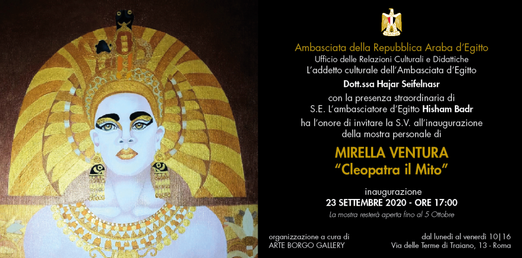 Mercoledì 23 settembre 2020 alle ore 17.00 si inaugura presso l’Ambasciata della Repubblica Araba d’Egitto, Ufficio delle Relazioni Culturali e Didattiche, la mostra Cleopatra “il Mito” personale di Mirella Ventura a cura di Anna Isopo con testo e presentazione a cura del critico d’arte Cinzia Folcarelli.