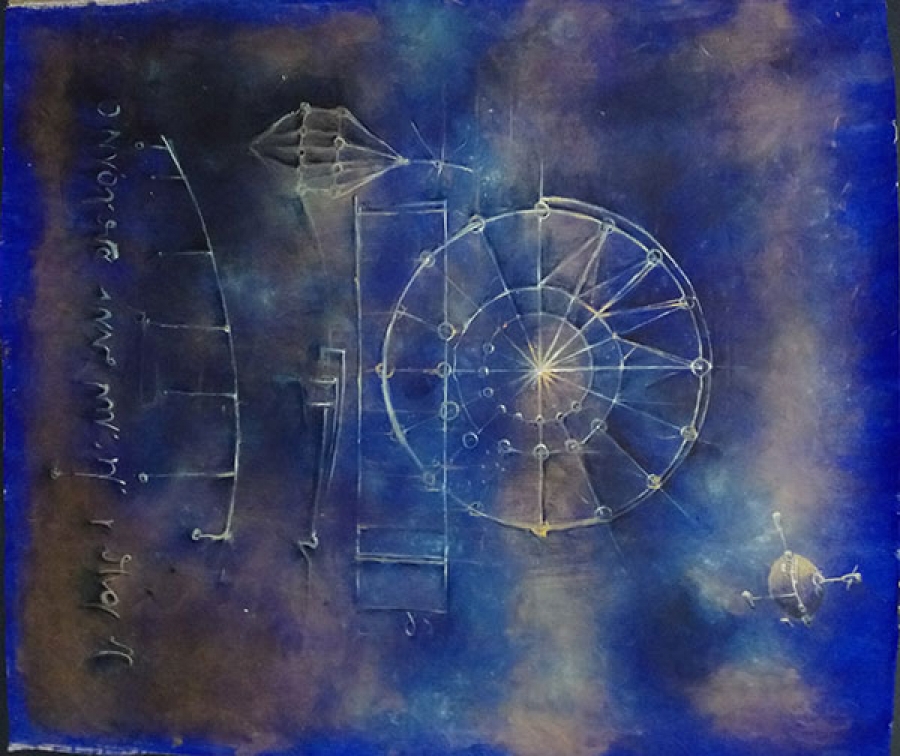 Veneziano ha scelto di lasciar parlare Leonardo, ponendo in primo piano la sua straordinaria opera tecnica e scientifica, arricchendola di quell’afflato artistico che accosta il pensiero alla poesia. Parola scritta e disegno tecnico, esaltati da colori concettuali e onirici insieme, si sublimano nella levità poetica dell’arte: ruote, cannoni, congegni meccanici, formule matematiche, danzano fra stelle e pianeti avvolti nell’immensità siderale che è metafora sia della vastità potenziale del sapere umano, sia di quell’ignoto che ancora sfugge alla conoscenza. Una pittura intrisa di Realismo Magico che ammanta di meraviglia le intuizioni di Leonardo, e sfiora il Simbolismo nel tratteggiare aeree visioni di volti e marchingegni; metafora della levità celeste dell’ingegno umano, quando messo al servizio del progresso civile. La concretezza delle opere leonardiane assurge allo status di bellezza dell’intelligenza, così come nella concezione di Plotino (che fu poi anche quella rinascimentale); l’utile aristotelico e platonico si arricchisce dell'intuizione dell’artista che crea l'unità fra le parti: il pensiero matematico, la sua traduzione in segni e disegni, risplende nella simmetria, si fa icona di civiltà e trionfo dell’intelletto.