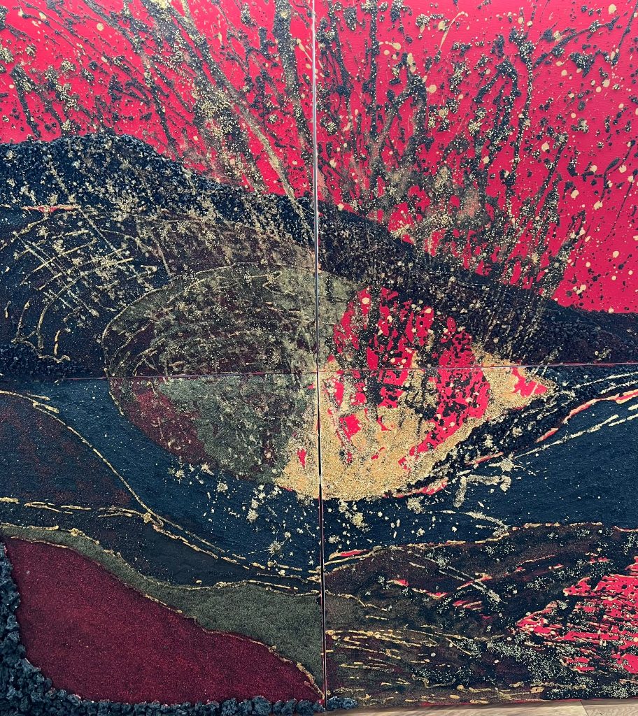 Sì tratta di installazioni in Pittoscultura,tecnica che ha elaborato l’artista utilizzando cenere lavica del vulcano Etna amalgamata con vernici e cristalli, fondono perfettamente la sua visione artistica al realismo della lava che fuoriesce dal cratere durante le eruzioni del vulcano più attivo d’Europa, invitando gli spettatori a intraprendere un viaggio di interpretazione e scoperta.