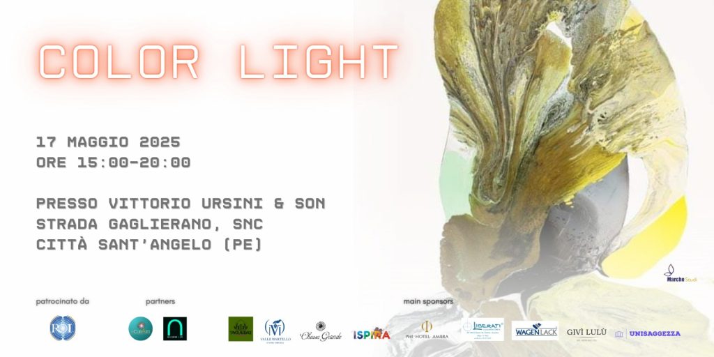 Sabato 17 maggio 2025, a Città Sant’Angelo (PE), lo Spazio delle Arti e del Futuro Pensiero Givì Lulù, all’interno della sede Ursini & Son, ospiterà Color Light, evento culturale dedicato alla luce come principio creativo e alla relazione come forma d’arte.