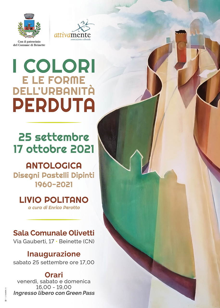 A distanza di circa due anni dalla precedente mostra antologica ospitata all’interno delle antiche scuderie della Fondazione Amleto Bertoni a Saluzzo e curata dal critico Giorgio Barberis, recentemente scomparso, la figura di Livio Politano (Beinette/Cn, 1937) torna alla ribalta, grazie alla volontà del Comune di Beinette di presentare al pubblico una scelta rappresentativa della sua produzione, a partire dal 1960 e comprendente anche i dipinti più recenti. L’esposizione antologica allestita opportunamente nella Sala Comunale Olivetti permetterà ai visitatori di ripercorrere un periodo di creatività che dura ormai da oltre sessant’anni, caratterizzato anche da importanti frequentazioni intellettuali, intrattenute, a cominciare dalla fine degli anni ’60, nelle città di Torino, Roma, Firenze e Vicenza, ma anche in altre località nazionali e internazionali, con un costante e instancabile impegno artistico, che si è manifestato attraverso un valente impiego delle tecniche grafiche (matite, carboncini, pastelli) e pittoriche (oli su cartone, tela e tavola), non disgiunto da una tensione a riflettere sulle condizioni della nostra esistenza, in rapporto alle problematiche dell’ambiente urbano e di quello naturale in cui siamo inseriti. Come ha scritto Paolo Marzotto, in occasione della sua personale del 1994 in Palazzo Muttoni a Vicenza, la “coerenza è evidente nella ispirazione di Politano, che nella pittura, che pratica come arte per l’arte e non arte per la vita (è infatti di professione dirigente di una grande impresa italiana), trasfonde una aspirazione ad un mondo onirico in cui il groviglio dei sentimenti diventa architettura fondendosi nella natura”.