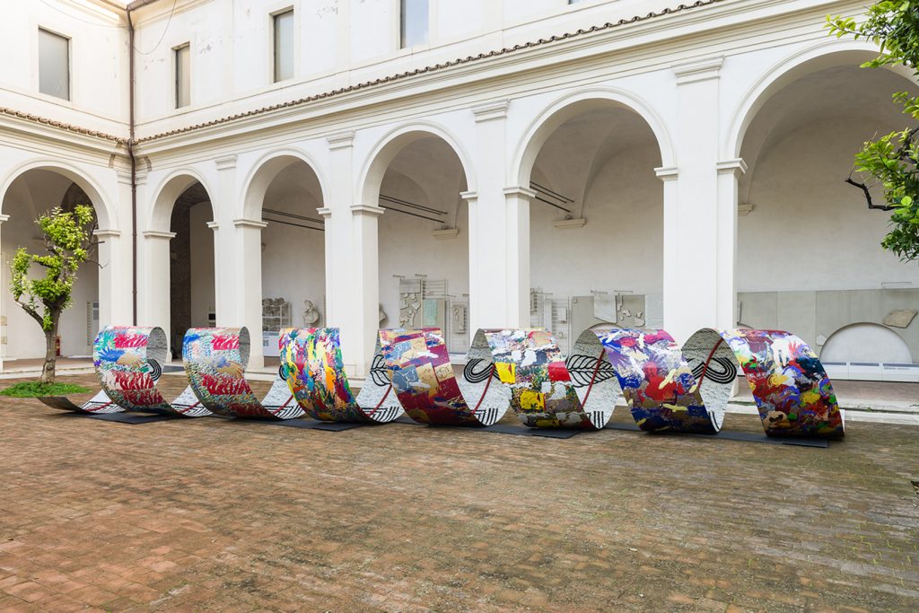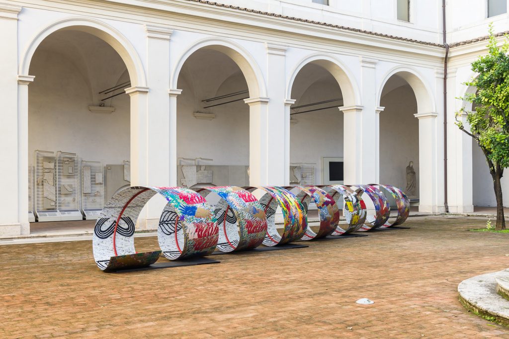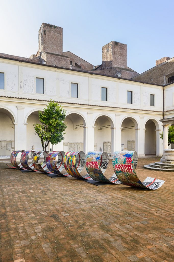 Il lato esterno invece ha un impatto cromatico intenso che evoca la forza della vita in un “mondo a colori”, ispirato al mondo Romano e al mondo Dace. Attraverso più di 50 disegni, attraverso la metamorfosi, ho interpretato alcune rappresentazioni marmoree del fregio della Colonna Traiana e della statuaria dei Musei della Romanità a Roma, da cui mi sono ispirata, creando simboli che, ripetuti, diventano icone. I simboli, le icone e le scritture sono gli strumenti della sua personale evocazione, per costruire una nuova storia che non contraddice né riproduce, ma affianca l’opera originale da un’ottica libera e immaginativa.