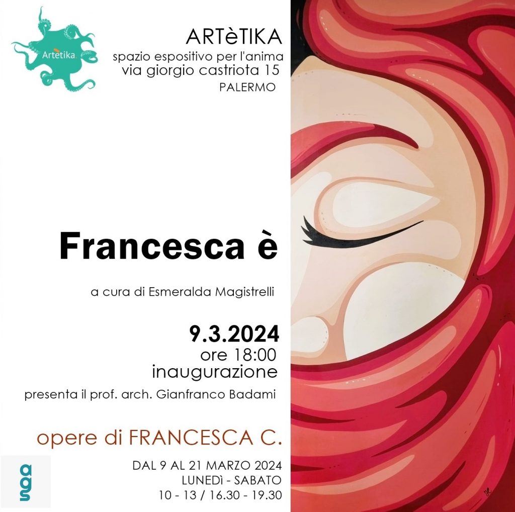 Le giovani donne alla conquista, non solo del podio di Sanremo ma della scena artistica dove la parità sembra più vicina rispetto ad altri settori sociali ed economici. Francesca C. è un giovane talento siciliano che dipinge la consapevolezza ed il rispetto per se stessa in quanto donna. Da sabato 9 marzo, alle 18,00 sarà in mostra con “Francesca è” da Artètika Spazio espositivo per l’anima in via Giorgio Castriota, 15 a Palermo. L’esposizione, curata dalla gallerista Esmeralda Magistrelli, in collaborazione con AGS_studio, sarà presentata dal professore e architetto Gianfranco Badami. Visitabile fino al 21 marzo dalle 10.00 alle 13.00 e dalle 17.00 alle 20.00 dal lunedì al sabato. Ingresso libero. Info: 333/5747244.
