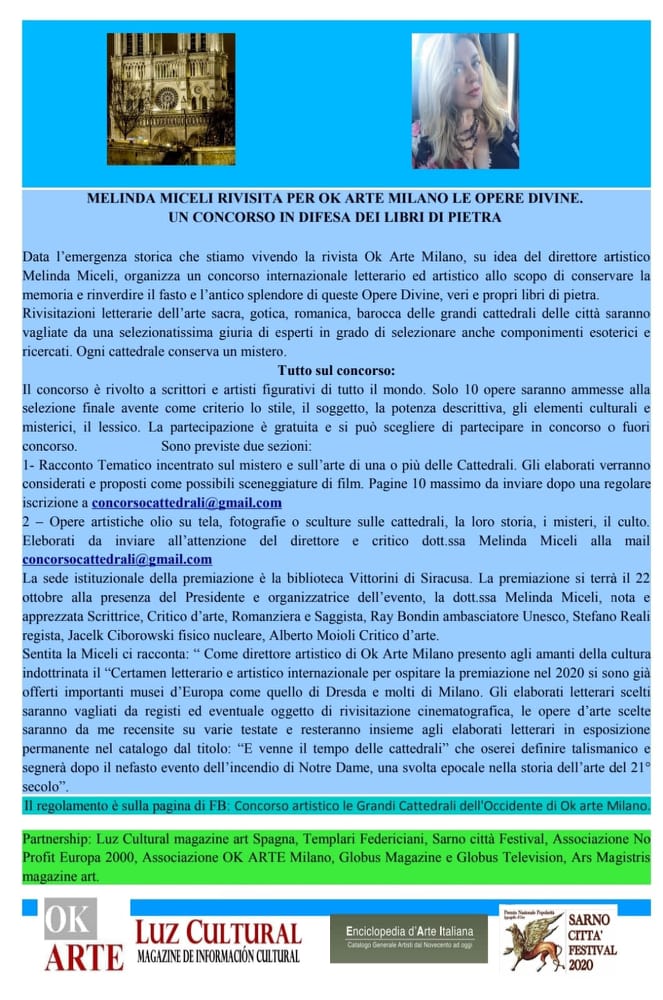 Data l’emergenza storica che stiamo vivendo la rivista Ok Arte Milano, su idea del direttore artistico Melinda Miceli, organizza un concorso internazionale letterario ed artistico allo scopo di conservare la memoria e rinverdire il fasto e l’antico splendore di queste Opere Divine, veri e propri libri di pietra.