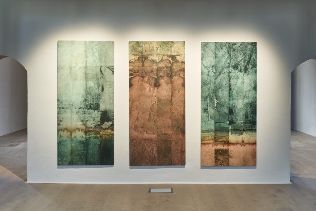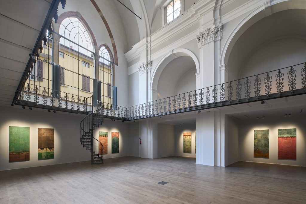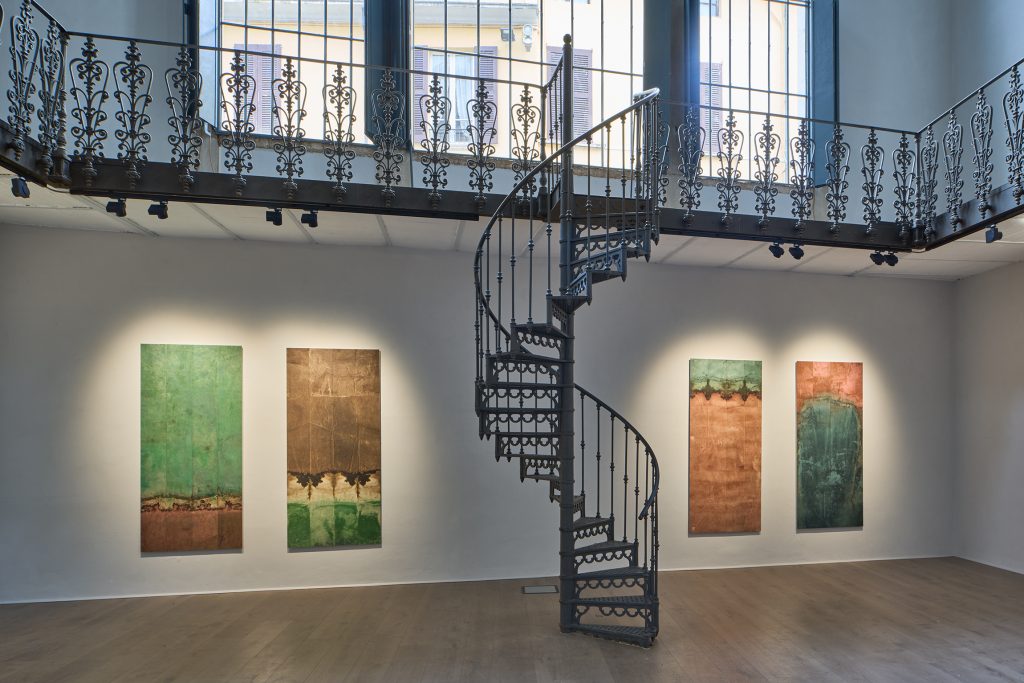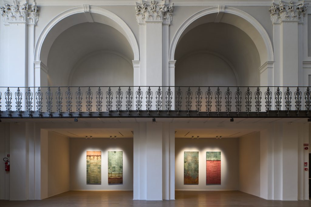 Un omaggio al territorio liminare tra Brescia e Bergamo capitali della cultura. Un dono voluto dalla curatrice, Maddalena Carnaghi, per restituire e valorizzare la bellezza e l'identità, sia dei paesaggi naturali, sia della tradizione pittorica. Si è chiamato un grande land artist, Riccardo Ajossa, maestro delle tecniche della carta (in questo caso la carta ottenuta seguendo la tradizione coreana Hanji, la carta più longeva e naturale che esista) e dell'estrazione dei pigmenti naturali. Riccardo restituisce una mappa di frammenti: momenti e luoghi percorsi in cui ha estratto i colori propri dei territori, li ha studiati con sapienza botanica e li ha classificati. Poi ne ha fatto una cernita e l'ha sviluppata in esercizi: opere alte due metri in cui le tinture naturali hanno risalito la cArta coreana per capillarità e si sono incontrate.