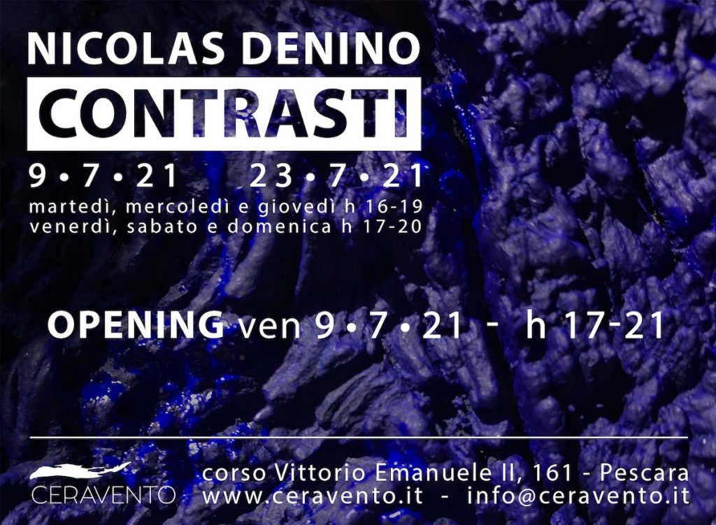 Un messaggio di denuncia verso la società contemporanea che prende forma e vive nei cerchi blu, fluttuanti nell’universo, che si avvicinano e si allontanano, alla ricerca di un contatto che fa fatica ad arrivare. Ceravento – area di condivisione dell’arte e spazio culturale di Pescara – ospita “Contrasti”, la prima mostra personale di Nicolas Denino. Per l’artista, nato in Uruguay e residente in Toscana, l’evento pescarese è un’occasione speciale, non solo perché è la sua prima personale, ma anche perché è un modo per riconnettere la sua discendenza alla sua arte: il bisnonno negli anni della Grande guerra lasciò il suo paese di origine, Pratola Peligna, per trasferirsi a Montevideo. L’evento inaugurale si svolgerà venerdì 9 luglio, dalle 17 alle 21; poi la mostra sarà visitabile fino al 23 luglio.