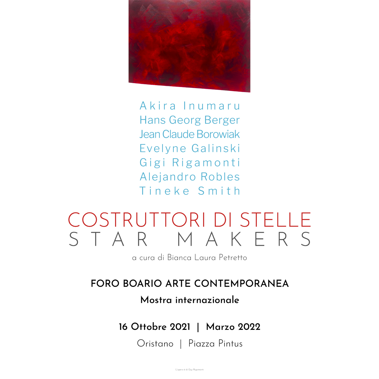 Costruttori di Stelle - Star Makers è una mostra d'arte contemporanea con artisti internazionali provenienti da tutto il mondo a cura della direttrice artistica Bianca Laura Petretto. Akira Inumaru, Hans George Berger, Jean Claude Borowiak, Evelyne Galinski, Gigi Rigamonti, Alejandro Robles, Tineke Smith si sono dati appuntamento nel nuovo spazio espositivo dedicato all'arte contemporanea, il Foro Boario di Oristano, per raccontare e esplorare il tema della stella, interpretandola simbolicamente attraverso la pittura, scultura, grafica, installazioni, video arte, mixed media.