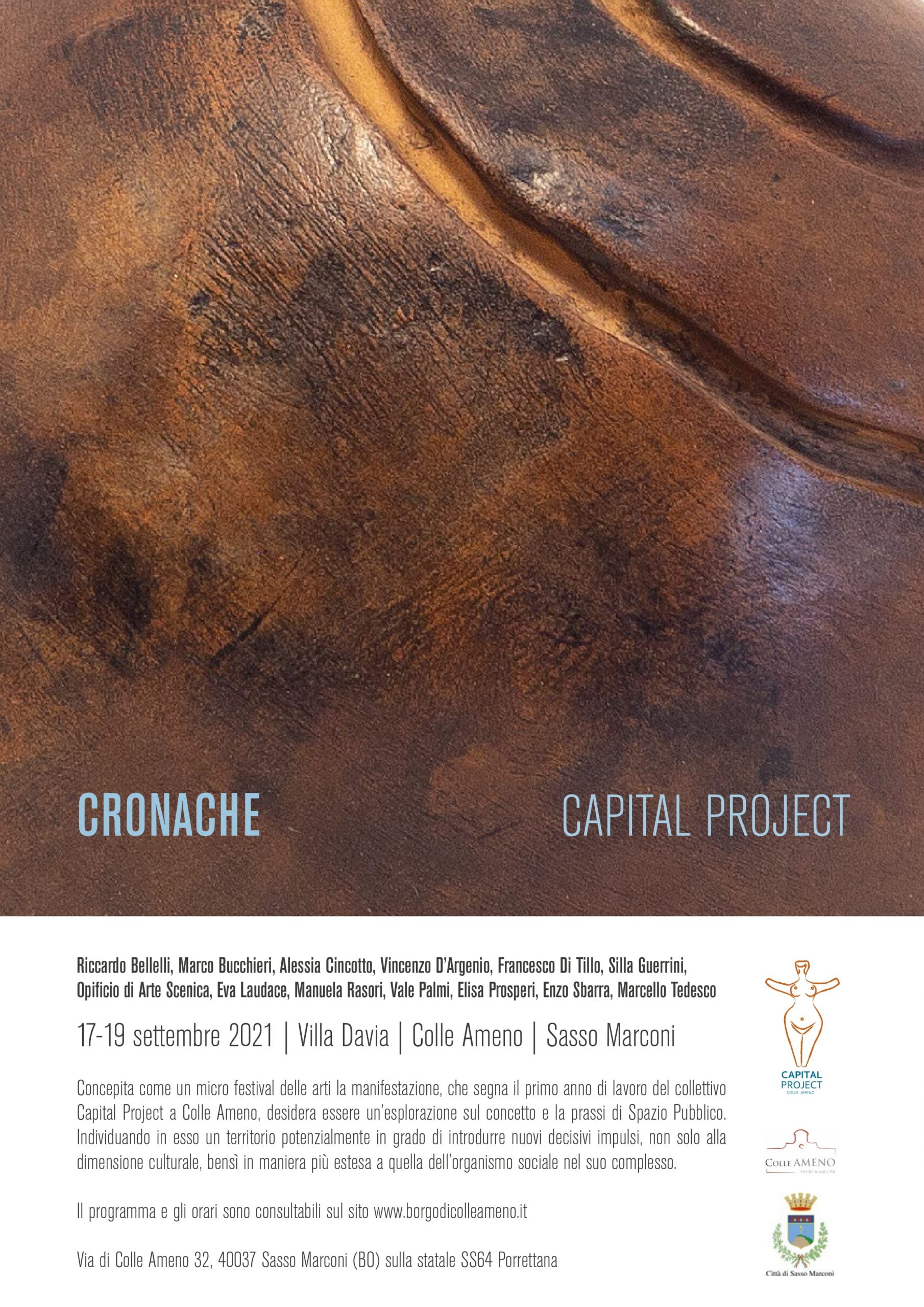 Questo piccolo festival delle arti segna il primo anno dalla fondazione del collettivo Capital Project e delle attività di questo all’interno del Borgo di Colle Ameno. Il periodo intercorso, per quanto breve e caratterizzato da una crisi globale, ha ugualmente permesso agli artisti di sviluppare una serie di attività in stretta relazione con il territorio e gettare le basi per un programma articolato e per certi versi inedito nelle finalità e nelle modalità. Il punto di partenza è stato quello di considerare il lavoro artistico come una forza capace di inserirsi nei processi della vita civile e determinarne, per certi versi, alcuni aspetti. Difatti durante il corso dell’anno, sia per fronteggiare la sconcertante situazione pandemica sia per approfondire una pratica artistica in grado di svolgere un ruolo attivo e puntuale e per certi versi utile alla comunità, il collettivo ha deciso di indagare il concetto e la prassi di Spazio Pubblico. Individuando in esso un territorio potenzialmente in grado di introdurre nuovi decisivi impulsi non solo alla dimensione culturale ma, in maniera più estesa, a quella dell’organismo sociale nel suo complesso.