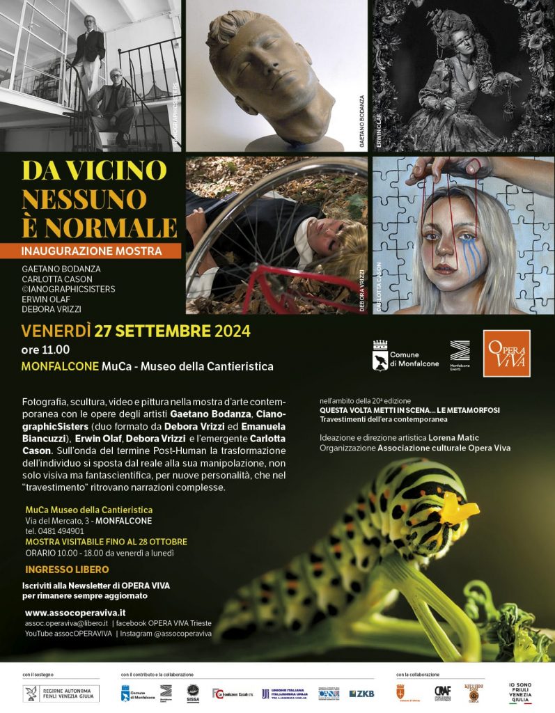 Alla presenza dell’artista Gaetano Bodanza e dell’emergente Carlotta Cason si inaugura al MuCa - Museo della Cantieristica di Monfalcone, venerdì 27 settembre alle ore 11.00, la mostra d'arte contemporanea “Da vicino nessuno è normale”, curata da Lorena Matic, ideatrice e direttore artistico dalla 20° edizione de ““Questa volta metti in scena... Le metamorfosi”.