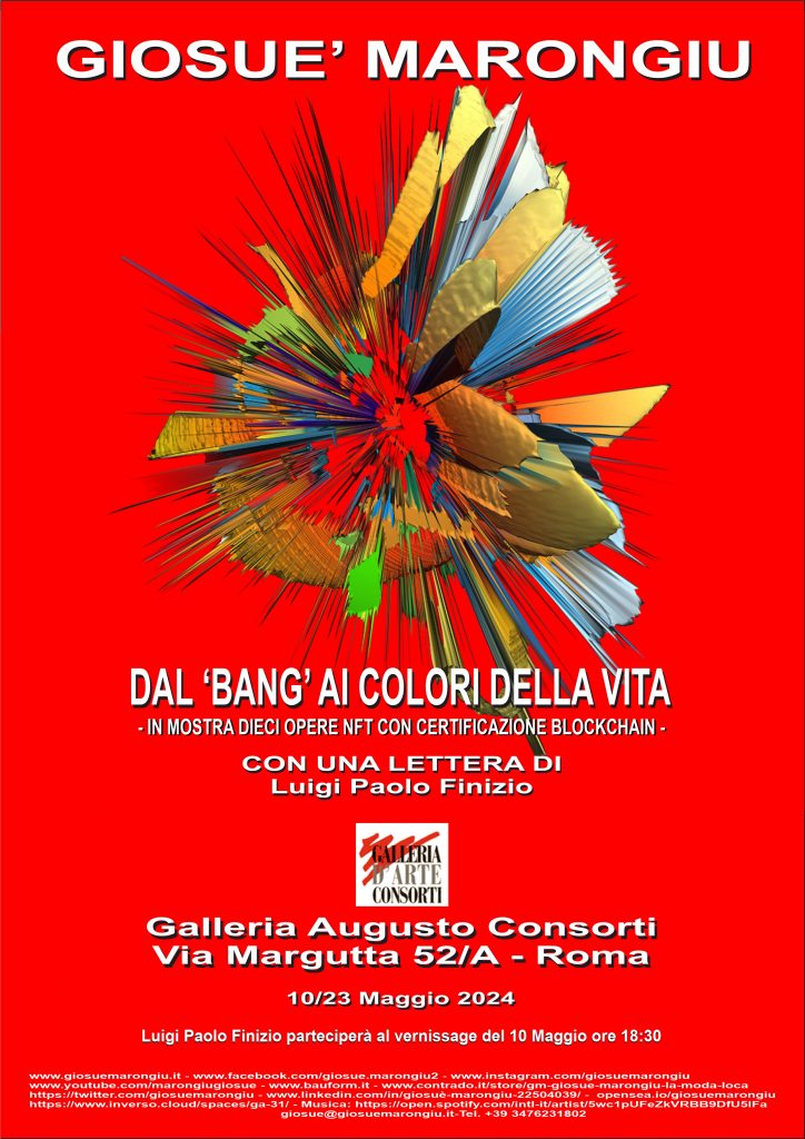 Una Mostra Epocale della produzione artistica di Giosuè Marongiu. Dieci opere digitali NFT e NFC stereometriche con certificazione Blockchain. Sarà presente Giosuè Marongiu per tutta la durata della mostra, dal 10 al 23 Maggio, per incontrare gli studenti delle scuole, delle Accademie e di chi vorrà approfondire su questo nuovo rivoluzionario linguaggio espressivo dell'arte del nuovo millennio. Sarà presente al vernissage Luigi Paolo Finizio, scrittore e storico dell'arte con una lettera indirizzata a Giosuè Marongiu.