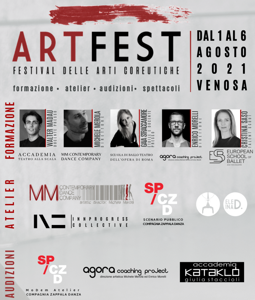 Danza e formazione in Basilicata con ARTFEST – Festival delle arti coreutiche, piattaforma di alta formazione, ricerca e diffusione coreutica. L’edizione del 2021 si svolgerà dal 1 al 6 agosto abitando i luoghi del borgo antico della città di Venosa (PZ) con azioni coreografiche e performance site specific, momenti di alta formazione per danzatori e danzatrici, atelier di comunità per famiglie, bambini/e e persone che vivono una condizione di fragilità.
