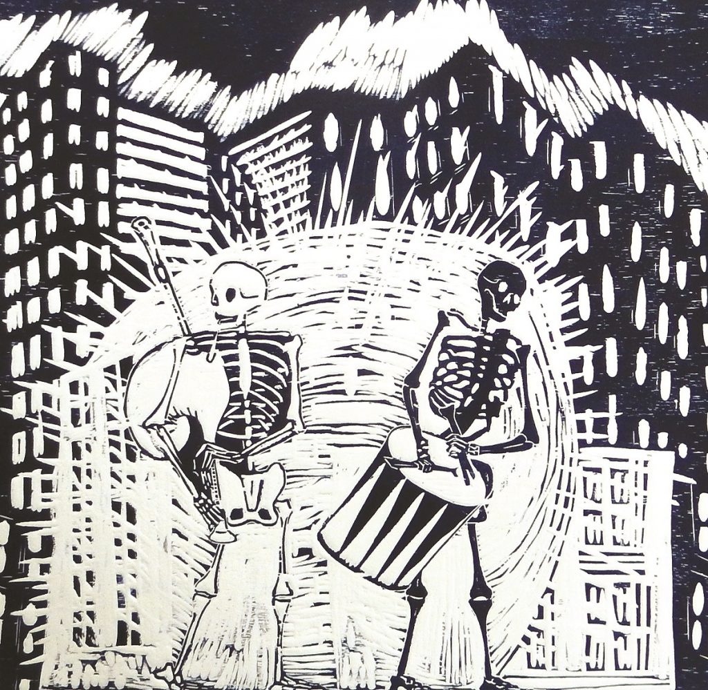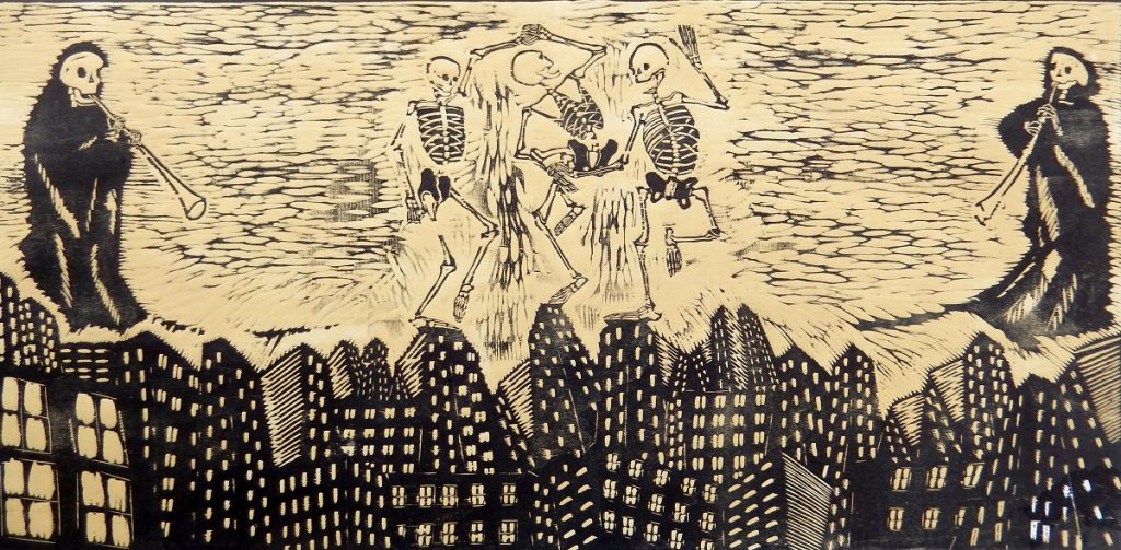 All’interno degli splendidi locali del Garum, Biblioteca e Museo della Cucina e del Boscolo Circo Massimo, la sera e la notte di Halloween e, ancor di più, il giorno di Ognissanti e quello dei Morti saranno teatro di una mostra ardita, inedita e squisitamente sui generis: non commerciale, non piacevole nè semplice e della durata di soli tre giorni; impermanente ed apparentemente insensata come la vita e che, come la vita, trova il suo senso nell’essere vissuta. Una mostra che vi farà conoscere l’antica, mistica e misterica, danza macabra di medievale memoria e lo farà attraverso 10 xilografie e 5 matrici xilografiche della serie di danze macabre preparate da Leandro Lottici, esposte insieme ad una serie di XVII grandi disegni a dimensione d’uomo: un ideale fregio continuo di oltre 25 metri, realizzato direttamente in loco, in cui la Morte danza con lo spettatore. Specchi evocativi d’iconografie conosciute, da Dürer e Botticelli a Banksy, volti a destrutturare e ricostruire l’immaginario di chi guarda e di chi, fra questi, dai grandi disegni avrà il coraggio di lasciarsi guardare.
