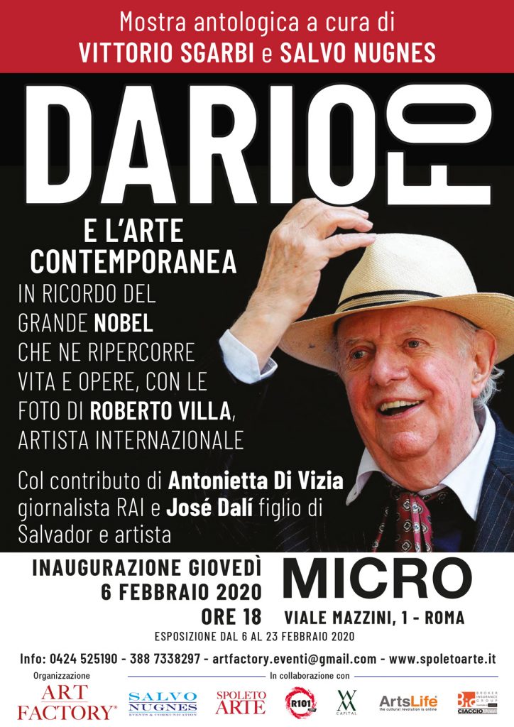 Dario Fo, una delle menti più brillanti e uno dei personaggi più controversi del Novecento. A lui è dedicata la prossima mostra antologica a cura di Vittorio Sgarbi e di Salvo Nugnes che darà largo spazio anche all’arte contemporanea. L’inaugurazione, prevista per le 18 di venerdì 6 febbraio, avrà luogo presso lo spazio espositivo Micro, in viale Giuseppe Mazzini 1, a Roma. La rassegna è presentata dal curatore di mostre e grandi eventi Nugnes e gode del contributo della giornalista RAI Antonietta Di Vizia e dell’artista José Dalì, figlio di Salvador Dalì.