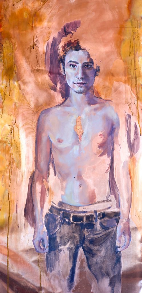 La dimensione terrestre e umana si esprime nei dipinti realizzati su materiali come sacchi di plastica e ferro acidato. L’uomo, gettato nel mondo, non può fare a meno di esserci: egli non può ignorare la sua stessa presenza ed è costretto perciò a sviluppare un suo progetto esistenziale. Il metallo, come l’uomo, è quindi la grezza materia prima sulla quale eventi e incontri agiscono ininterrottamente. La superficie ossidata, mutevole e imperfetta, diviene metafora dell’uomo, materia grezza plasmata dagli eventi e dagli incontri, in tensione verso un ideale di perfezione sempre sfuggente. L’essere nel mondo, infatti, costringe l’uomo non solo a confrontarsi con il suo progetto di vita individuale, ma anche ad entrare in una dimensione relazionale, dove l’incontro con l’altro influisce sulla sua esperienza e percezione. Dal basso della sua dimensione terrestre, l’uomo anela ad un’ideale di perfezione realisticamente irraggiungibile rappresentato dalla seconda dimensione, quella ideale, che si manifesta tramite le opere su rame e policarbonato trasparente. Il desiderio di ascensione dell’uomo verso l’ideale incorruttibilità divina è qui rappresentato, mentre gli inserti in foglia d’oro diventano tracce dell’avvenuta trasformazione: le difficoltà e le sofferenze che accompagnano il percorso evolutivo dell’uomo provocano ferite che lasciano filtrare la luce dell’ideale.
