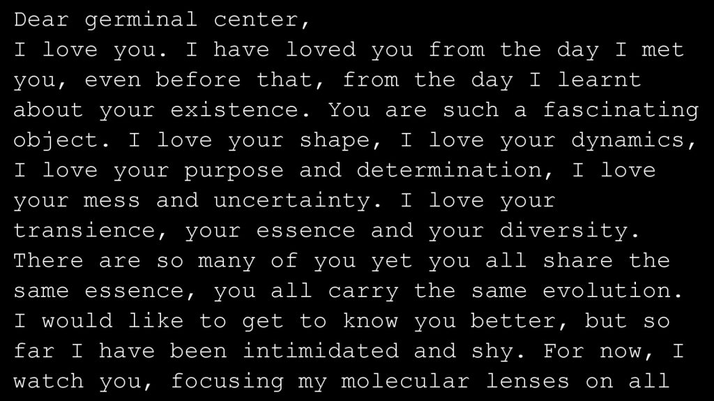 Dear Cell is part of the interdisciplinary project Perception of Self and Nonself in Life, which was developed by Regina Hübner in 2019 at the Institute IMèRA, in cooperation with the Institute of Research for Modern Immunology CIML (https://imera.univ-amu.fr/en/resident/regina-hubner) and further, with the Institute for Neurobiology (Inmed http://www.inmed.fr/en/).