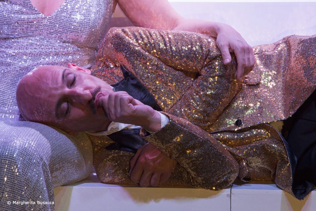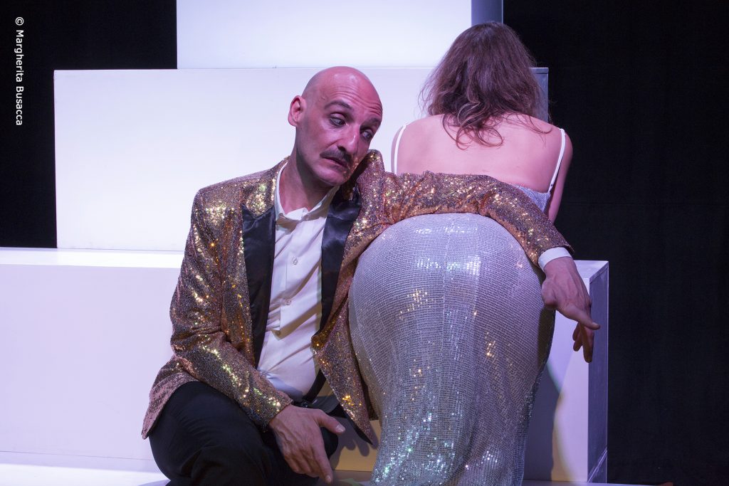 “Decadenze” di Berkoff è un testo del 1981, eppure è di un'attualità sconvolgente. Scritto per una coppia di attori/performer, impegna ciascuno in un doppio ruolo. Si propone come caustica riflessione sulle dinamiche di potere nella scalata sociale e sulle diaboliche macchinazioni messe in atto anche solo per non scivolare al gradino immediatamente sottostante di questo altare innalzato al dio denaro. Ecco perché, nella messa in scena del regista Gaddo Bagnoli, fra paillette e lustrini dal ridondante gusto barocco, l'azione ruota invece attorno ad una essenziale piramide a gradoni. Simbolico ziqqurat di feroci pratiche sociali, è attorno a questo che si muovono, nei loro personaggi sempre grotteschi e spietati, Claudia Franceschetti e Andrea Magnelli, premiati, nel 2013, insieme a Marco Olivieri, alla Fêtes Internationales du Theatre (Canada) per “Pauraedesiderio”, concordemente ritenuto Miglior Spettacolo, tanto dalla giuria che dal pubblico.