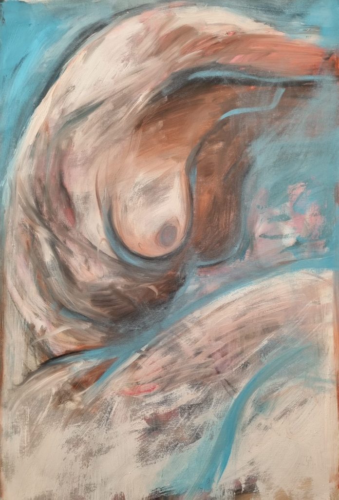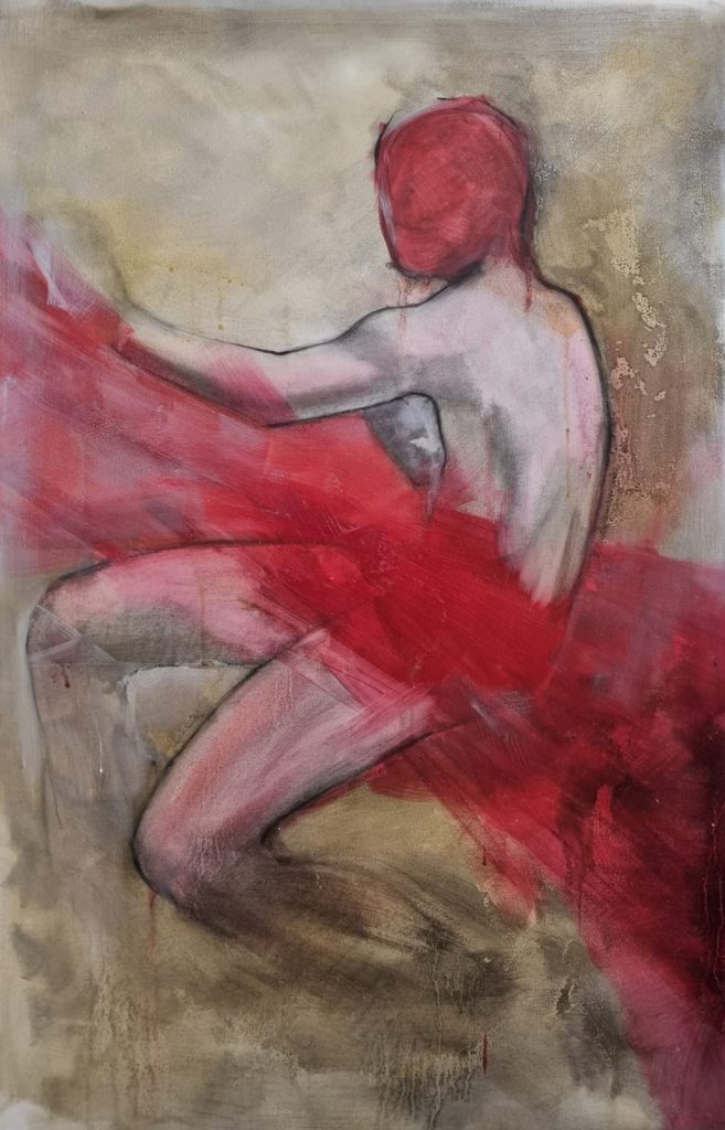 Le sue opere raccontano questa “caduta” come perdita di equilibrio, ma anche come una tensione verso l’autenticità. Le figure, immerse in spazi vuoti e atmosfere sospese, luoghi dove l’assenza di coordinate definite e il non finito amplificano la condizione di smarrimento.