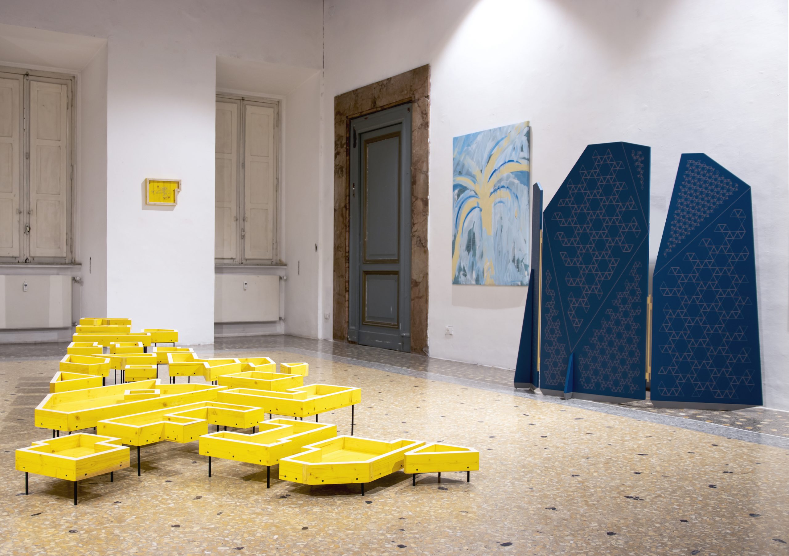 Il rapporto tra esteriorità e funzione, nei prodotti di Mentemano, è ben percepibile nel paravento Zefiro, i cui pannelli s’ispirano alla leggerezza e alla libertà di movimento delle barche a vela. Anch’esso, come Grimilde, assicura ampi margini di personalizzazione, soprattutto grazie all’infinita libertà compositiva resa possibile dalle cerniere. Zefiro è stato inserito in uno spazio caratterizzato dai colori vivaci dei quadri di Sebastiano Bottaro e dell’installazione di Germain Ortolani, rafforzando così la sensazione di gioia e libertà racchiusa nel concept originale del paravento.