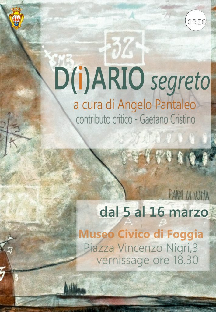 Giovedì 5 marzo, presso la Sala Diomede del Museo Civico di Foggia, il Patrocinio del Comune di Foggia, l’assessorato alla Cultura, nella persona di Anna Paola Giuliani, sarà inaugurata la mostra D(i)ario segreto, di Dario Damato, a cura di Angelo Pantaleo, direttore artistico dello spazio culturale Creo, con il contributo critico di Gaetano Cristino.