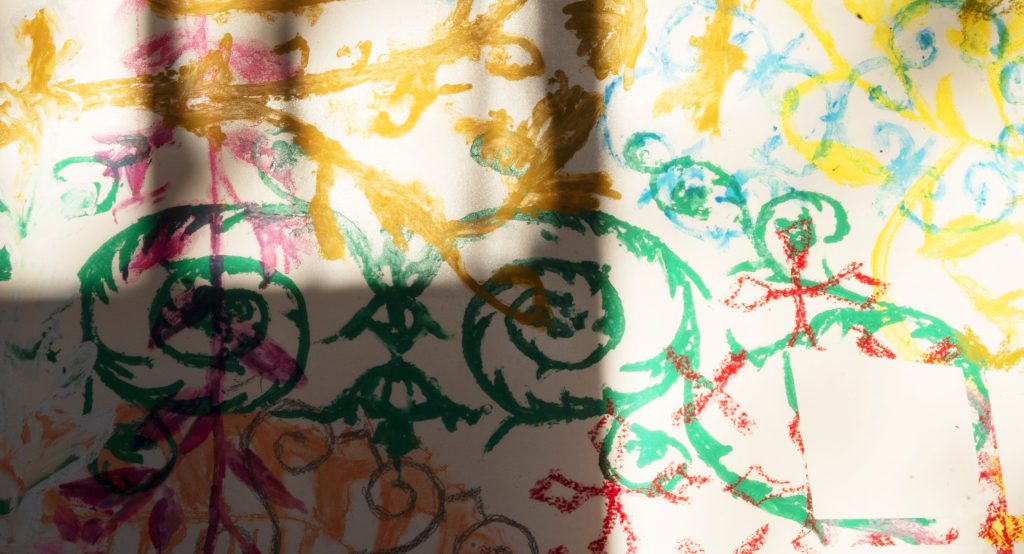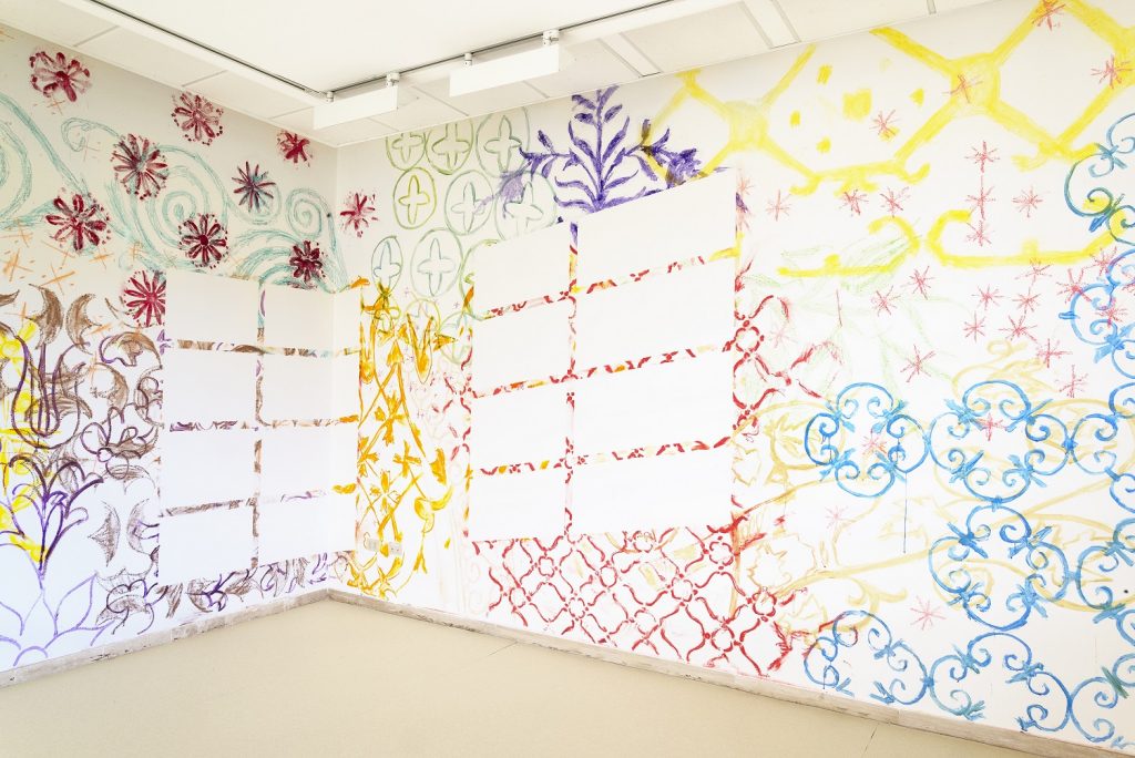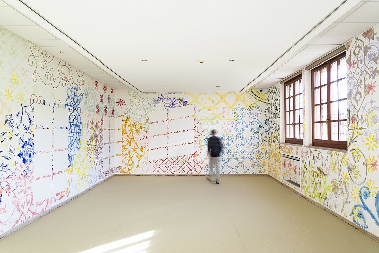Il progetto di Diego Miguel Mirabella dal titolo Vestiva inoltre una segreta felicità , creato specificamente per il Museo, si estende a tutte le pareti dello spazio. Non ci sono confini nel diramarsi dell’ornato, interrotto solo dall’artificio della luce riflessa delle finestre della sala creato dall’artista. La decorazione, che prende ispirazione dalle memorie visive dell’artista e dall’ornato musivo ravennate, diviene qui un paesaggio in continua evoluzione narrativa, stilistica e cromatica. Mirabella si muove su diversi registri culturali, dall’Occidente all’Oriente, e spaziando dalla pittura alla scultura, utilizza la decorazione ornamentale come una vera e propria lingua visiva e che a volte si intreccia con la parola al fine di narrare storie che, in questa occasione, conducono lo spettatore in una dimensione quasi onirica, in cui gli elementi si celano o si mostrano a chi guarda. I pigmenti presenti sulle pareti, uniti alla polvere di mosaico, avvolgono il pubblico che, come immerso nello spazio, diviene parte integrante dell’opera, della storia narrata dall’artista. Lo spazio continua la sua vita anche di notte, quando la luce artificiale esterna attraversa le finestre e si sovrappone all’illusione visiva creata dall’artista, custodendo una segreta felicità. Per la natura coinvolgente del progetto e con l’obiettivo di offrire un nuovo punto di vista, il pubblico potrà sostare all’interno dello spazio in modo informale, sedendosi per terra, sdraiandosi o nella modalità che più riterrà comoda per entrare in relazione con l’opera d’arte.