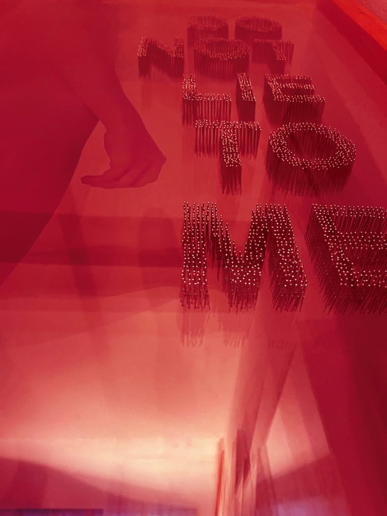 Nel primo ambiente azzurro una scritta a neon "Dislikeme" poggia su un letto di spilli d'acciaio. Nel secondo, di colore rosso, due opere fotografiche dal titolo "You dare b'cause You are" e "Do not lie to me" mettono in risalto l'unicità nella diversità, con un'attenzione al corpo come luogo politico.