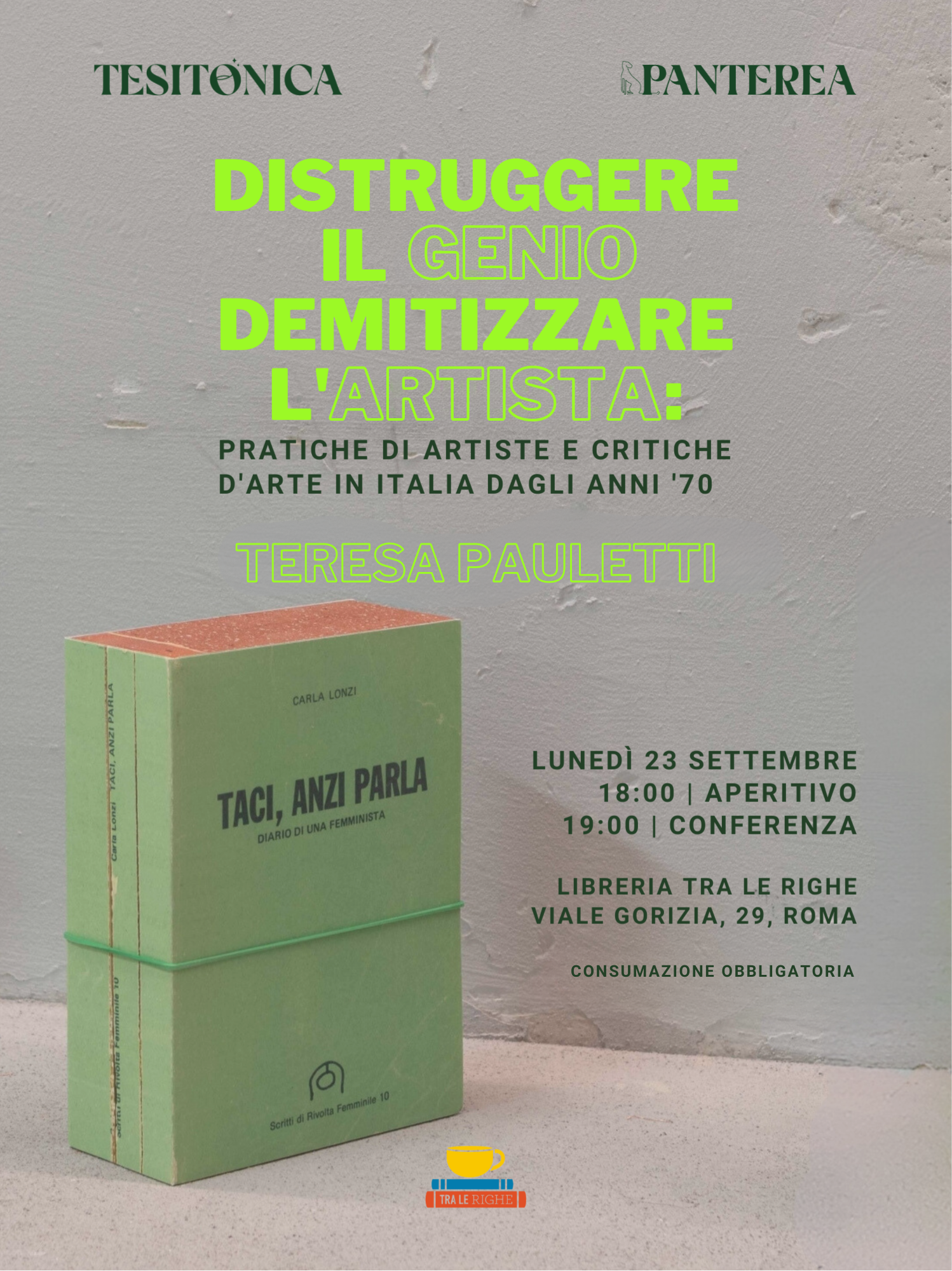 Teresa Pauletti, laureata in Storia dell’Arte a La Sapienza, presenta la sua ricerca dal titolo "Distruggere il Genio e demitizzare l'artista: pratiche di artiste e critiche d'arte in Italia dagli anni '70", nell'ambito della quale ha analizzato la genesi e lo sviluppo del concetto di Genio, il suo legame con il tema della virilità e la conseguente esclusione del genere femminile, per lungo tempo, dal mondo dell'arte.