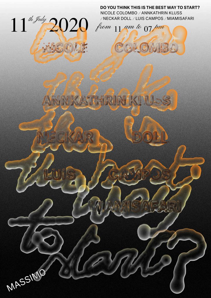 In occasione della sua prima mostra "Do you think this is the best way to start?" MASSIMO ospita una collettiva della durata di un giorno nel quartiere di Porta Venezia. Un camion vela, posto davanti alla facciata dello spazio in via Degli Scipioni 7, è il mezzo scelto per presentare le opere inedite di cinque giovani artisti internazionali: Luis Campos, Nicole Colombo, Neckar Doll, Annkathrin Kluss e MiamiSafari.
