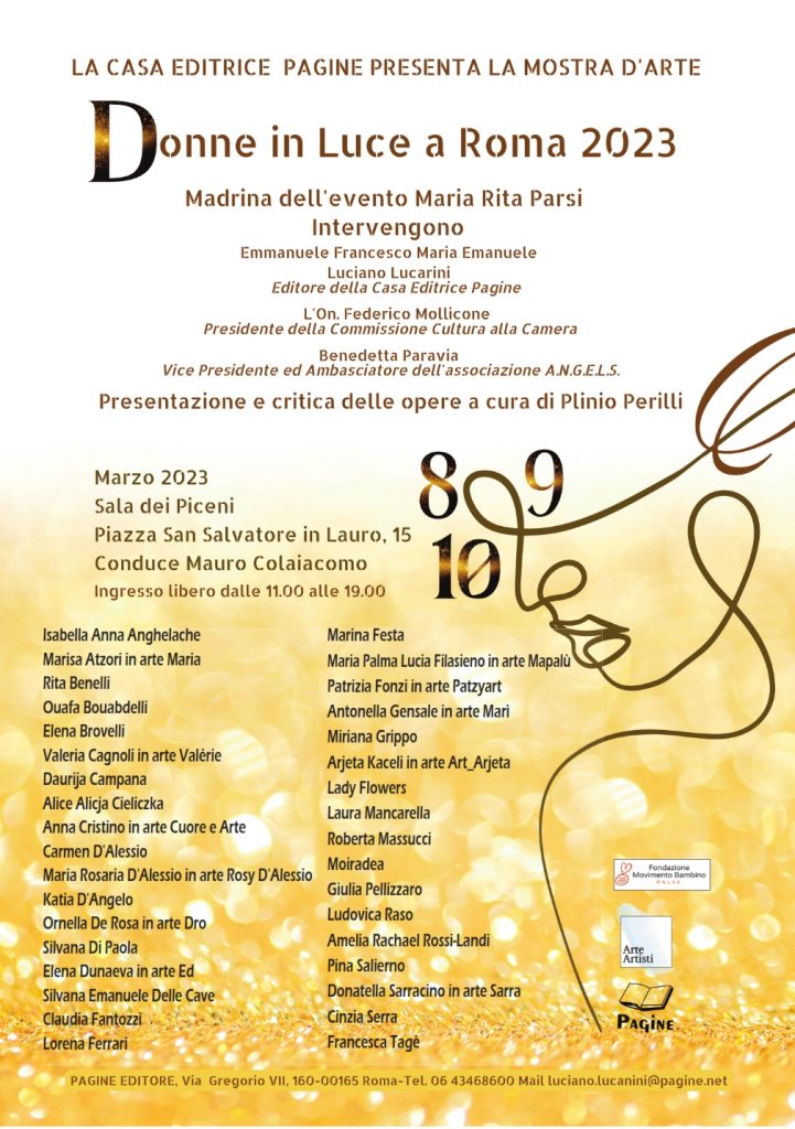 l'8, il 9 e il 10 marzo si terrà la mostra- evento Donne in Luce, presso lo storico complesso monumentale Pio Sodalizio dei Piceni a Roma.