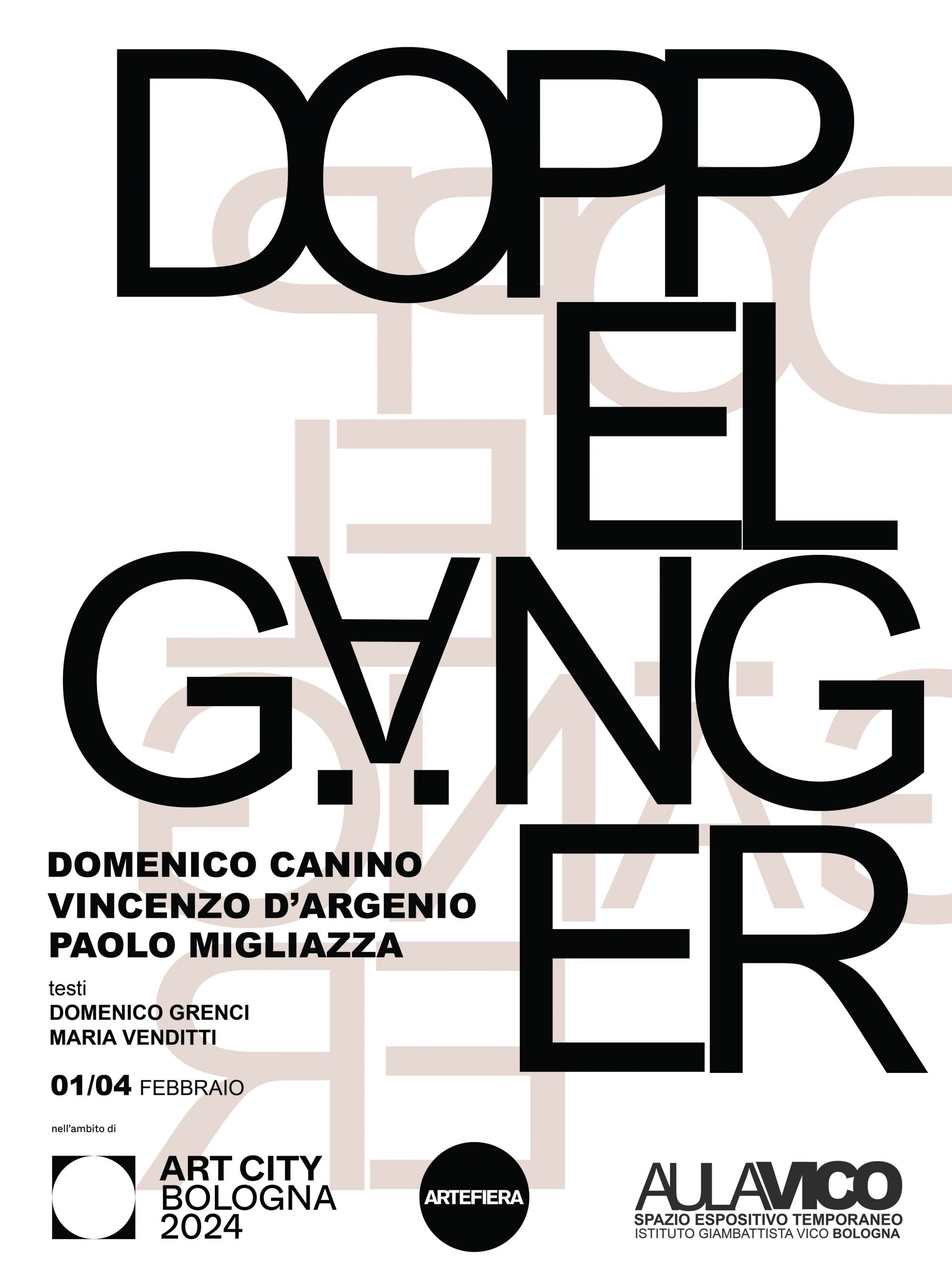 Nell’ambito di Art City Bologna 2024 e Arte Fiera, presso l’Aula d’Arte dell’Istituto d’Istruzione e Formazione Giambattista Vico, prende vita un nuovo progetto. Dall’incontro di tre differenti artisti e i loro linguaggi, Domenico Canino, Vincenzo D’Argenio e Paolo Migliazza, hanno deciso di far dialogare le rispettive poetiche in una mostra collettiva ospitata negli spazi di via della Ghisiliera. Da questa interazione è emerso un terreno comune sulle tematiche dell’antropomorfismo e del doppio, da cui il titolo dell’operazione. A differenza del concetto egizio di "Ka" che costituisce parte della personalità umana, il termine tedesco è composto da "doppel" "doppio" e "gänger" "che va, che passa" riferendosi a qualsiasi doppio o sosia di una persona. Per i tre autori, riflettersi nel proprio lavoro significa intraprendere un processo creativo intriso di un'incursione divina. Le teorie psicanalitiche presentano l'artista in una duplice veste: una in competizione con la divinità e l’altra in cui l'artista è strumento, a volte guidato da una divina presenza o da un demone persecutore di natura maligna. La collettiva aprirà giovedì 1 febbraio 2024 e sarà arricchita dai contributi di Domenico Grenci (artista) e Maria Venditti (sociologa/cyborg), offrendo due prospettive diverse ma complementari per approfondire i temi della mostra.