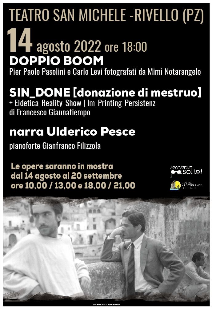 A legare i vari tematismi indagati da Pier Paolo Pasolini, Carlo Levi, Mimì Notarangelo e che oggi sono ripresi da Francesco Giannatiempo è l’autore, regista e attore Ulderico Pesce, che realizza un evento multidisciplinare tra fotografia, installazioni artistiche, musica e narrazione dal titolo ‘Doppio Boom’, accompagnato al pianoforte da Gianfranco Filizzola: dal 14 agosto alle ore 18.00 sarà ripetuto anche su prenotazione.