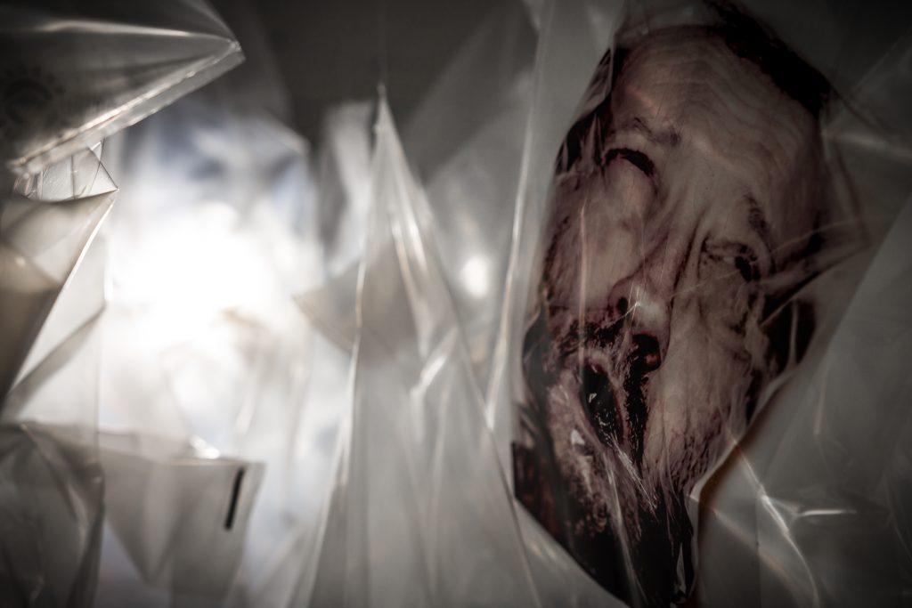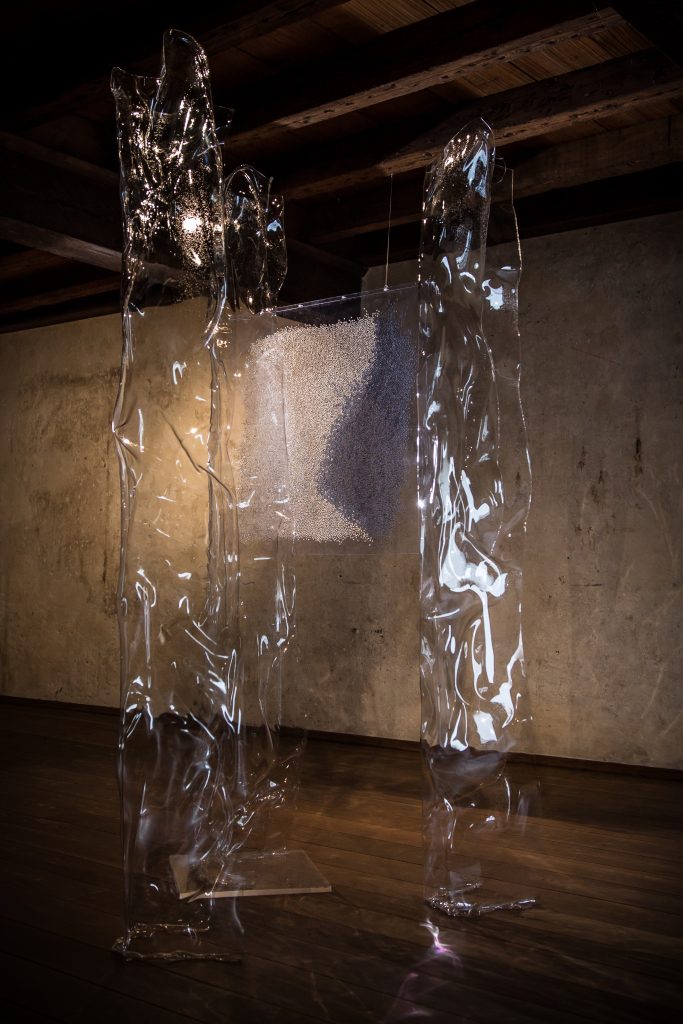 LA PRIMA MOSTRA DAL TITOLO "È PER SEMPRE" PRESENTA UN’INSTALLAZIONE INEDITA, LA GRANDE E SOFFOCANTE “LA FINE DEL PESCE”, LABIRINTO RICAVATO TRA UN MARE DI BORSE DI PLASTICA. OPERA CHE INTRODUCE ALL’INSTALLAZIONE TRASPARENZE, ENTRAMBE OPERE REALIZZATE DAI DUE ARTISTI.