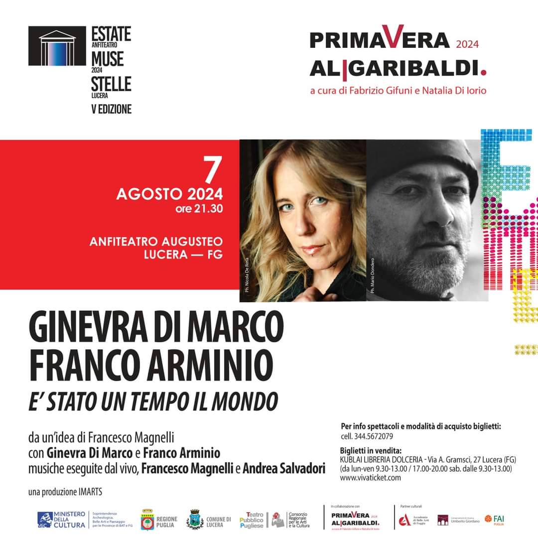 L’ottava stagione della rassegna curata da Fabrizio Gifuni e Natalia Di Iorio “PrimaVera al Garibaldi” promuove mercoledì 7 agosto alle 21.30 (ingresso alle 21), in prima regionale pugliese, all’Anfiteatro Augusteo di Lucera, lo spettacolo-concerto "È stato un tempo il mondo", con la poesia intensa di Franco Arminio e la canzone popolare di Ginevra Di Marco. La sua voce inconfondibile si unisce a quella di Franco Arminio, che è stato definito da Roberto Saviano “uno dei poeti più importanti di questo paese, il migliore che abbia mai raccontato il terremoto e ciò che ha generato”.