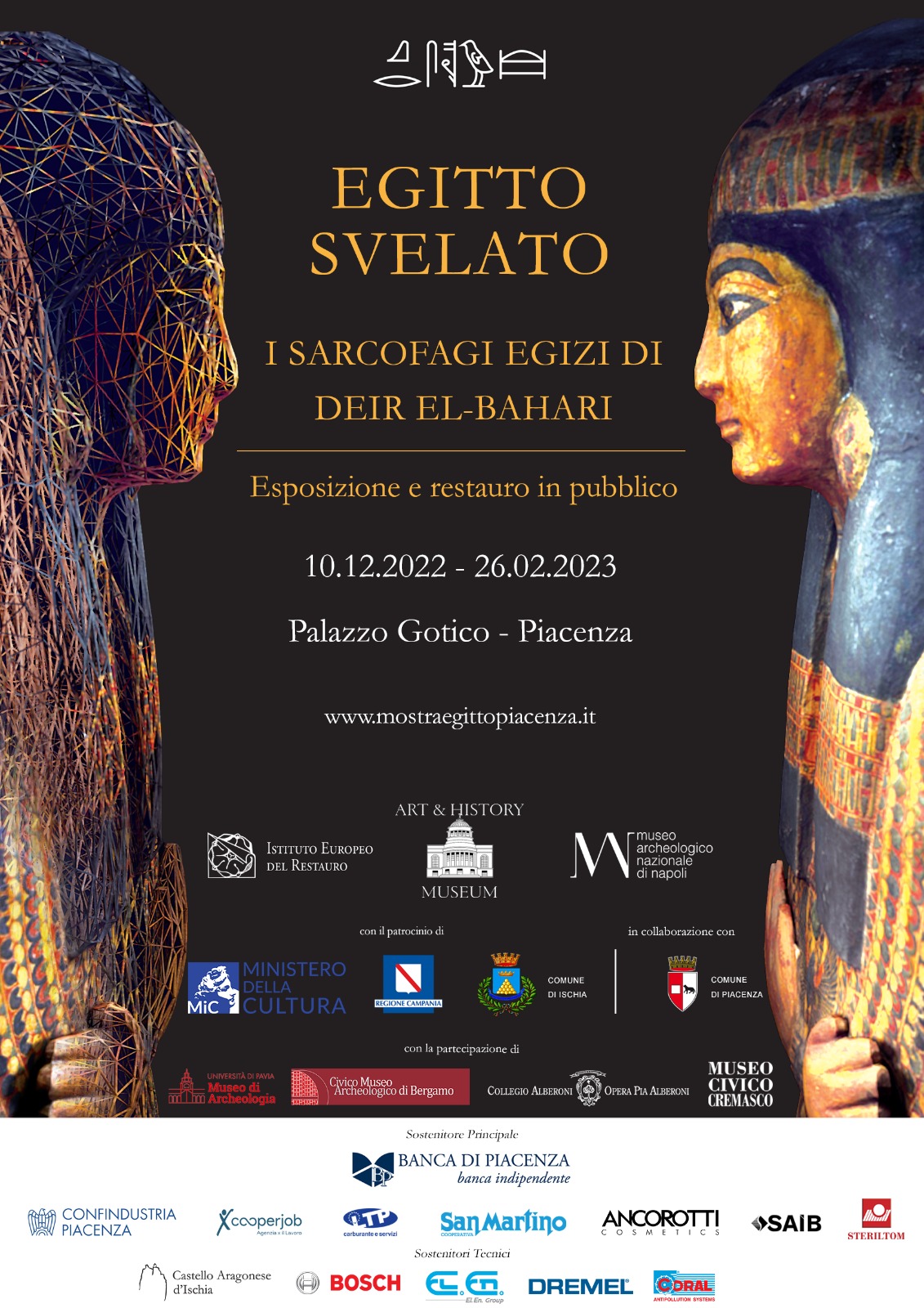 Una mostra sull'Antico Egitto che espone reperti originali provenienti dal Museo Reale di Arte e Storia di Bruxelles e da altri musei italiani tra cui il MANN, Museo Archeologico Nazionale di Napoli. Caratteristica unica: un vero laboratorio di restauro allestito all'interno del percorso espositivo permetterà ai visitatori di seguire dal vivo tutte le fasi del restauro di un sarcofago della XXI dinastia.