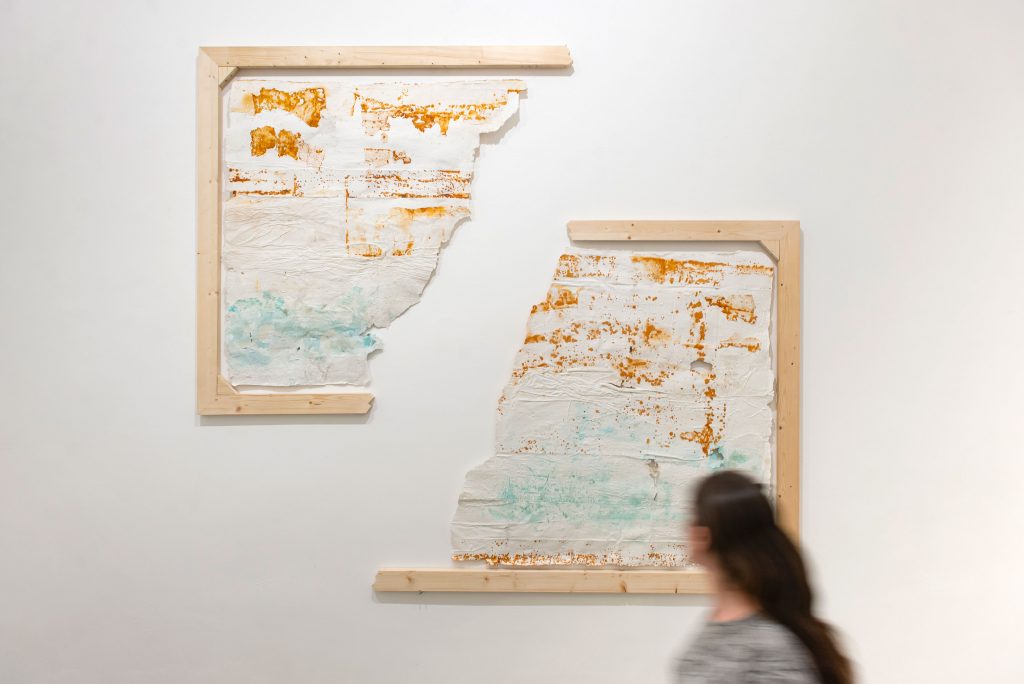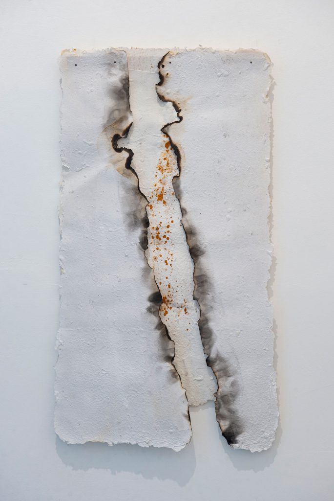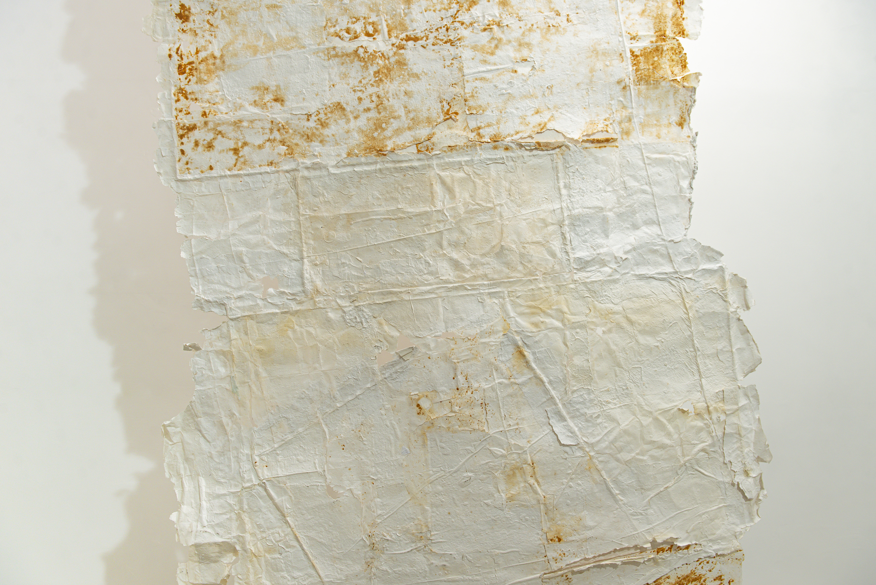 Il filo rosso, la costante compositiva dell'esposizione, è da identificare con la ruggine. Questo composto viene integrato nei lavori di Marialuna da un punto di vista pittorico ma soprattutto scultoreo. Infatti, l'ossidazione del ferro si verifica nel momento in cui la carta, come un materiale amorfo, viene manipolata e plasmata in forma plastica. Si possono notare quindi più livelli artistici, l'aspetto pittorico, quello incisorio dato dalla traccia-impronta, la lavorazione fisica della materia.