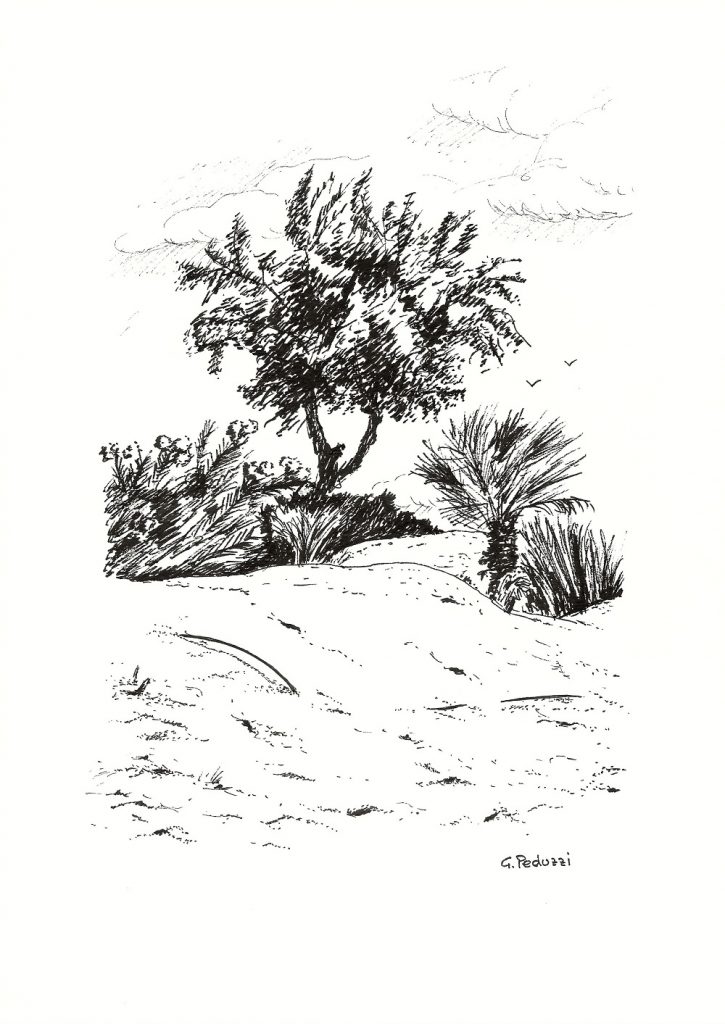Dietro all’ abilissima capacità di disegnatore di Giorgio Peduzzi attraversiamo, invece, una quarantina di disegni realizzati a matita grafite o con tecnica a china. Un ampio estratto accuratamente selezionato tra i numerosi disegni e le chine eseguite all’aria aperta "en plein air" e pubblicati nel libro "La discesa e poi il mare" (ed. Helicon) che si potrà apprezzare - in anteprima- nell'ambito della doppia esposizione. Un percorso che svela l'impagabile interpretazione di ogni singolo disegno di Giorgio Peduzzi accompagnato, come nel libro, da un "haiku", forma poetica giapponese composta in tre soli versi, semplice ed essenziale, che permette ad ogni singolo visitatore di interpretare il motivo di ogni opera esposta. Nel tratto che contraddistingue la sua caratteristica espressiva, il visitatore potrà esplorare in una sorta di "en plein air" le opere realizzate sia a china che a matita "nel viaggio senza tempo che va dal Pian del Cansiglio attraversando la pianura e poi giù fino al mare di Caorle".