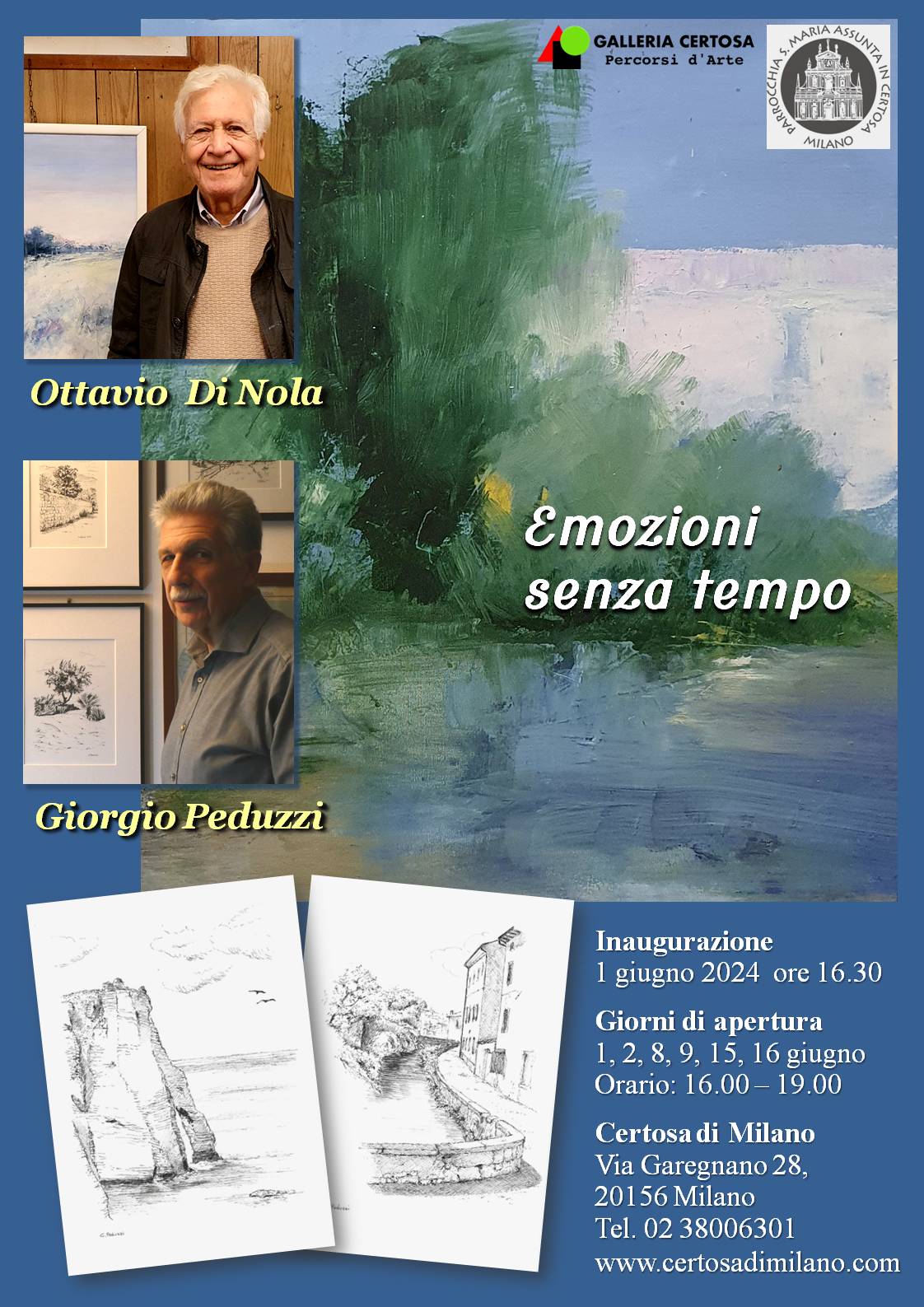 In occasione dell'uscita del libro "La discesa e poi il mare" di Giorgio Peduzzi, sabato 1 giugno alla Certosa di Milano, suggestivo e importante angolo di storia dell'Ordine Certosino di Milano, verrà inaugurata la doppia esposizione dal titolo "EMOZIONI SENZA TEMPO". Un viaggio senza tempo nel profondo di singole interiorità pittoriche di grande spessore artistico di Ottavio Di Nola e Giorgio Peduzzi.