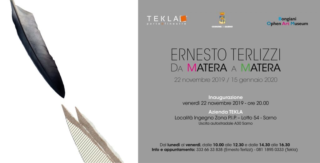 L’Azienda TEKLA , con il Patrocinio del Comune di Sarno, e la collaborazione di Bongiani Ophen Art Museum di Salerno, presenta la Mostra di Ernesto Terlizzi “Da Matera a Matera” . Esposizione allestita nei suoi spazi di Sarno dal 22 Novembre al 15 Gennaio 2020. L’artista per questo suo particolare evento presenta una serie di opere realizzate tra il 1975 e il 2019, (circa 60 opere tra carte, tavole e tele di varie dimensioni) su cui ha costruito i suoi “paesaggi dell’anima”.