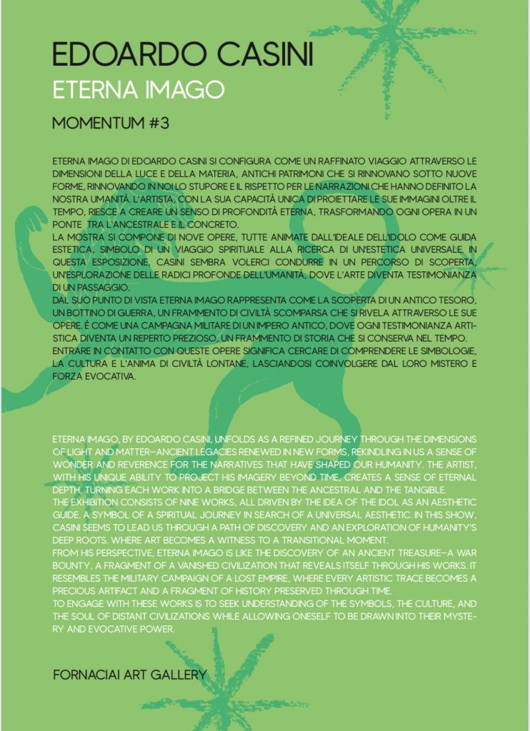 Fornaciai Gallery presenta Eterna Imago, una mostra dedicata a Edoardo Casini, che si svolgerà dal 3 al 10 luglio 2024. La mostra propone un viaggio tra luce e materia, invitando a riscoprire le radici profonde dell’umanità attraverso nove opere che utilizzano l’ideale dell’Idolo come simbolo di un percorso spirituale e culturale. Ogni pezzo diventa così un frammento di civiltà scomparsa, offrendo uno sguardo intimo e riflessivo.