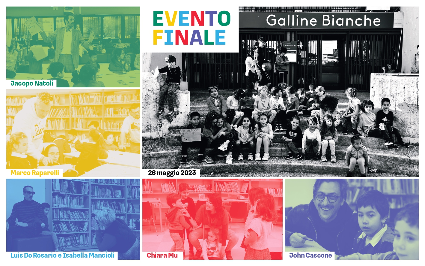Alla Biblioteca Galline Bianche sono stati realizzati cinque cicli di attività e laboratori dedicati a bambini e ragazzi a cura degli artisti John Cascone, Jacopo Natoli, Chiara Mu, Marco Raparelli e i fotografi Luis Do Rosario e Isabella Mancioli. Ogni laboratorio dal carattere multidisciplinare si è trasformato in un momento esperienziale, dove i partecipanti hanno condiviso spazio e tempo attraverso la creatività, esplorando insieme, creando le opere che verranno presentate venerdì 26 maggio a partire dalle ore 17:00.