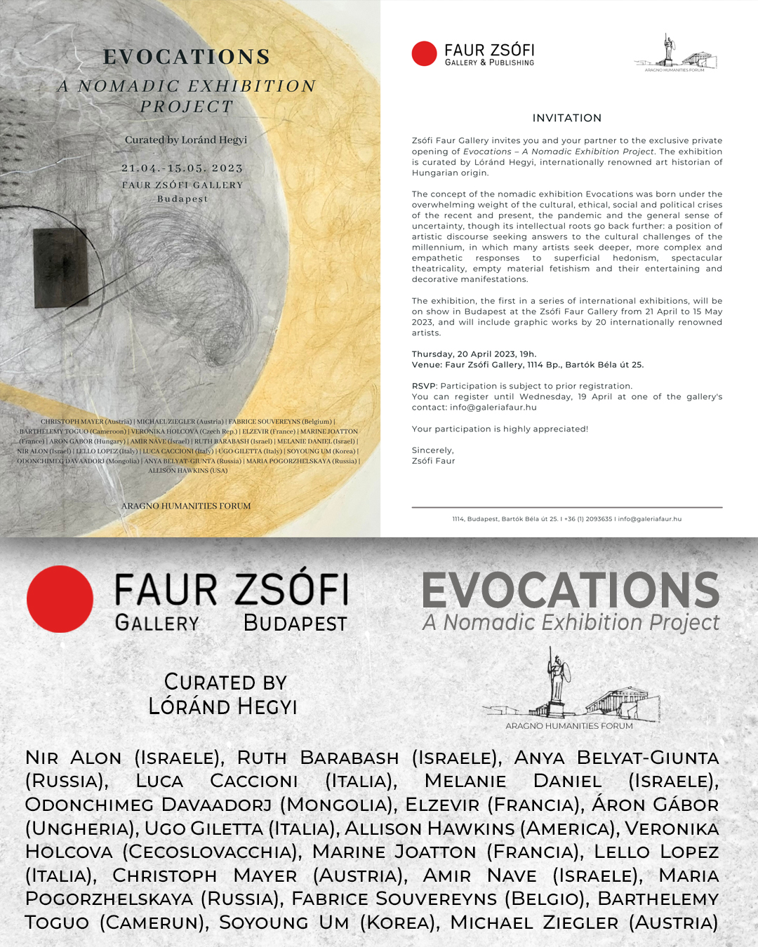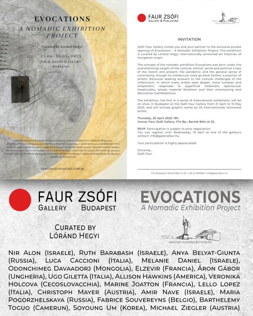 La mostra “Evocations - A Nomadic Exhibition Project”, a cura di Lorand Hegyi, è una iniziativa per vitalizzare le relazioni dirette tra artisti, gallerie, fondazioni, musei ed istituti culturali in differenti peiesi d’ Europa e del Mediterraneo. La singolarità del progetto è quella di presentare opere di solo disegno contemporaneo con un focus sulla nuova e autentica narrativa che ha origine dell’empatia, dalla fantasia radicale, dalla interiorità, che rivela le risorse umane di un’epoca del disorientamento intellettuale e morale profondo. Il linguaggio del disegno, con la sua spontaneità e sensibilità, con la libera e immediata espressione di fantasmi e visioni, con la offensiva sensualità, manifesta una possibilità di vero dialogo dall’interno ed dall’esterno, del personale e del collettivo.